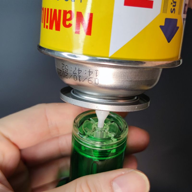 Bạn chỉ cần cắm đầu chuyển đổi vào bình gas du lịch, dốc ngược bình rồi tiến hành ấn nhẹ bình gas vào van nạp của bật lửa (khò). Có thể nghiên một chút để gas từ bình chảy sang bật lửa.