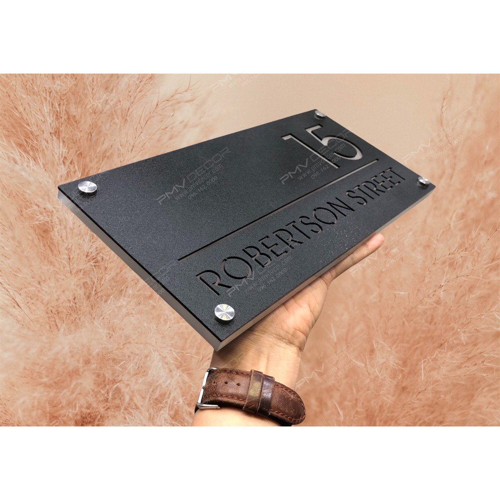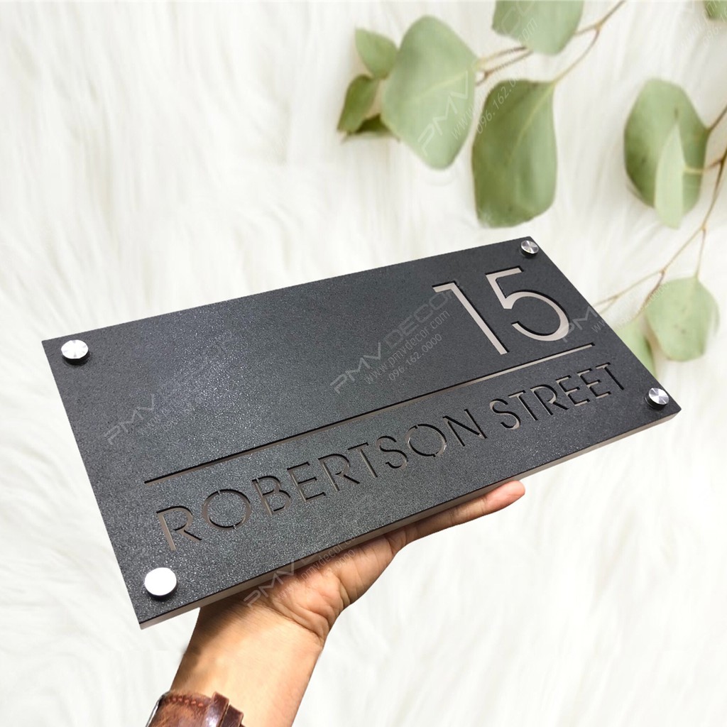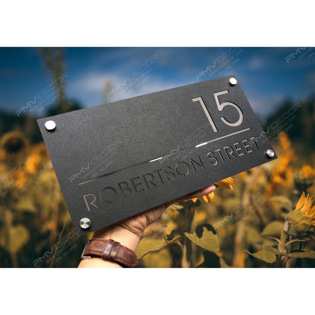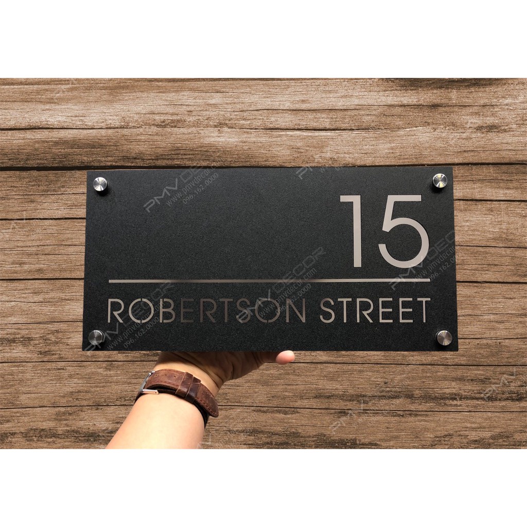Giới thiệu BẢNG, BIỂN SỐ NHÀ. Nền đen sần, nội dung màu trắng, âm bản, ngoài trời, BSN-PMV182