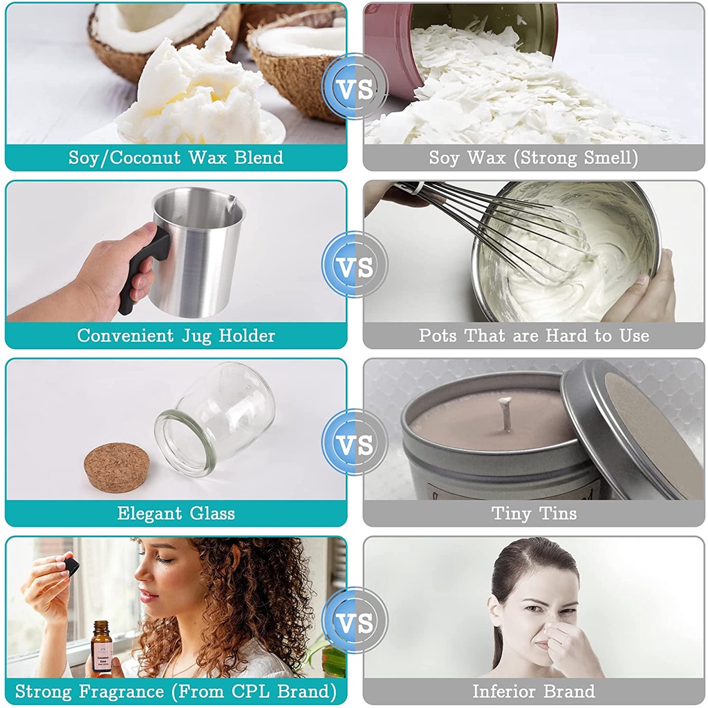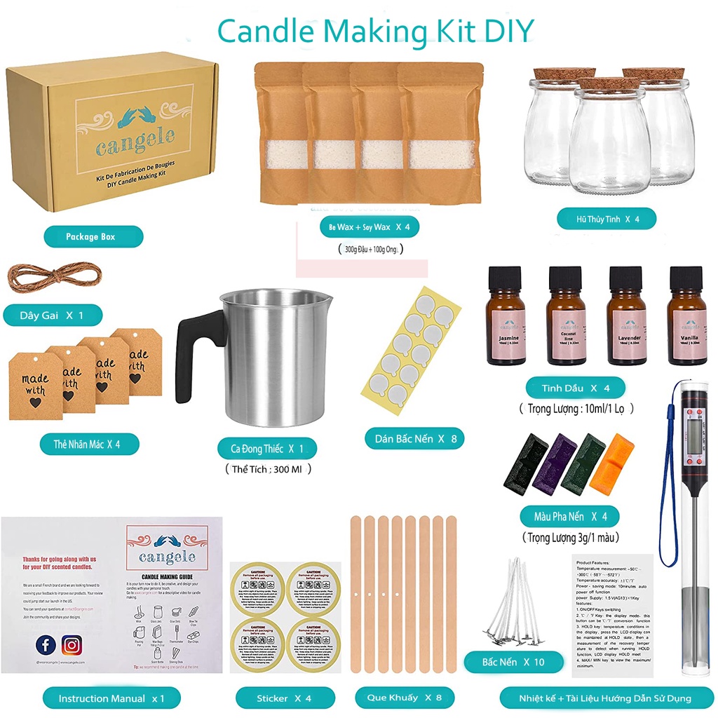Bộ Dụng Cụ Làm Nến Thơm Candle Making Kit Làm Quà Tặng Sinh Nhật Giáng Sinh Handmade⭐BEGINNER FRIENDLY : Bộ dụng cụ làm nến Candle Making Kit chứa mọi thứ bạn cần: 2lb. Sáp đậu nành / ong đã được đong sẵn thành 4 túi đựng, 4 Lọ tinh dầu cao cấp 10ml, 4 Lọ thủy tinh, Bấc gỗ, miếng dán trang trí, nhiệt kế, Nhãn cảnh báo và hướng dẫn sử dụng chi tiết cho các bạn mới bắt đầu để hướng dẫn bạn.