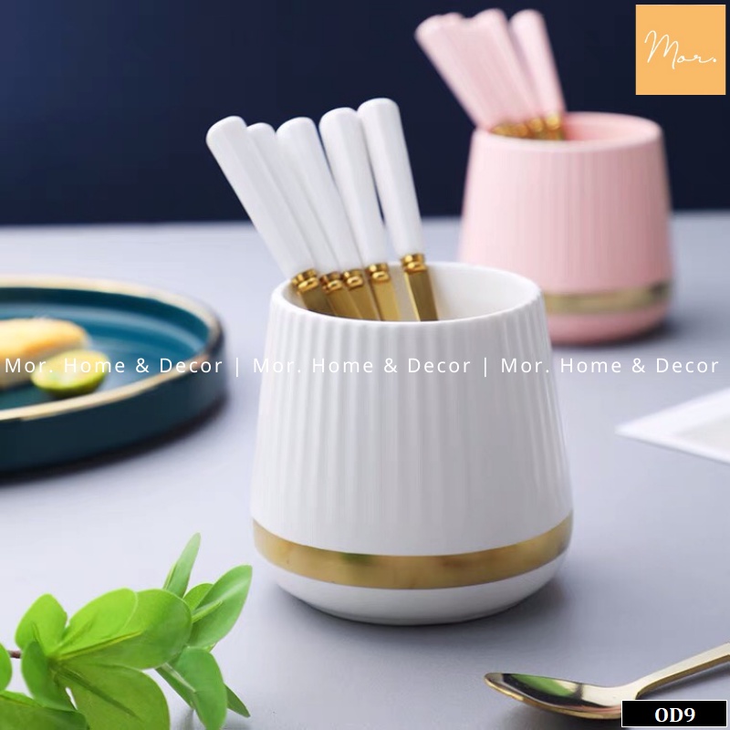 Bộ cốc sứ đựng thìa, dĩa sang trọng tạo thêm sự xinh xắn cho ngồi nhà.Chất liệu: