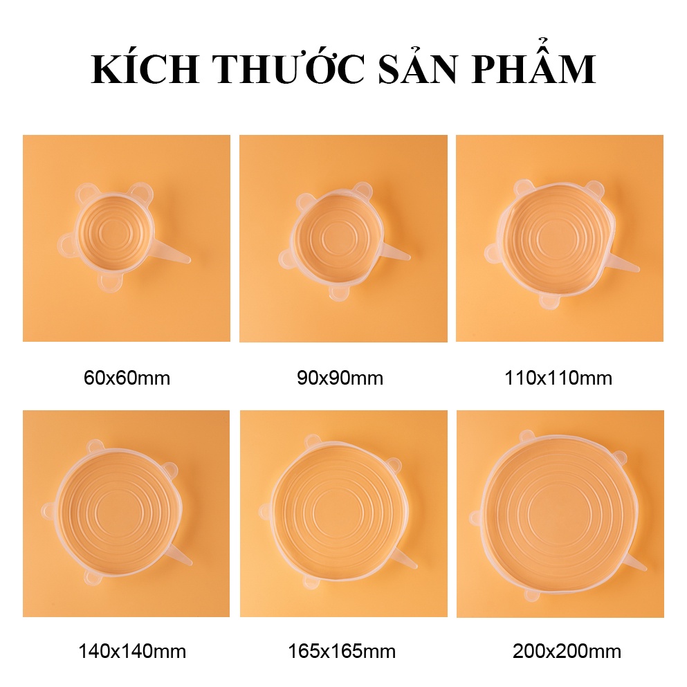 Bộ 6 màng bọc thực phẩm silicon đậy thức ăn, bảo quản đồ ăn tiện ích, thông minh