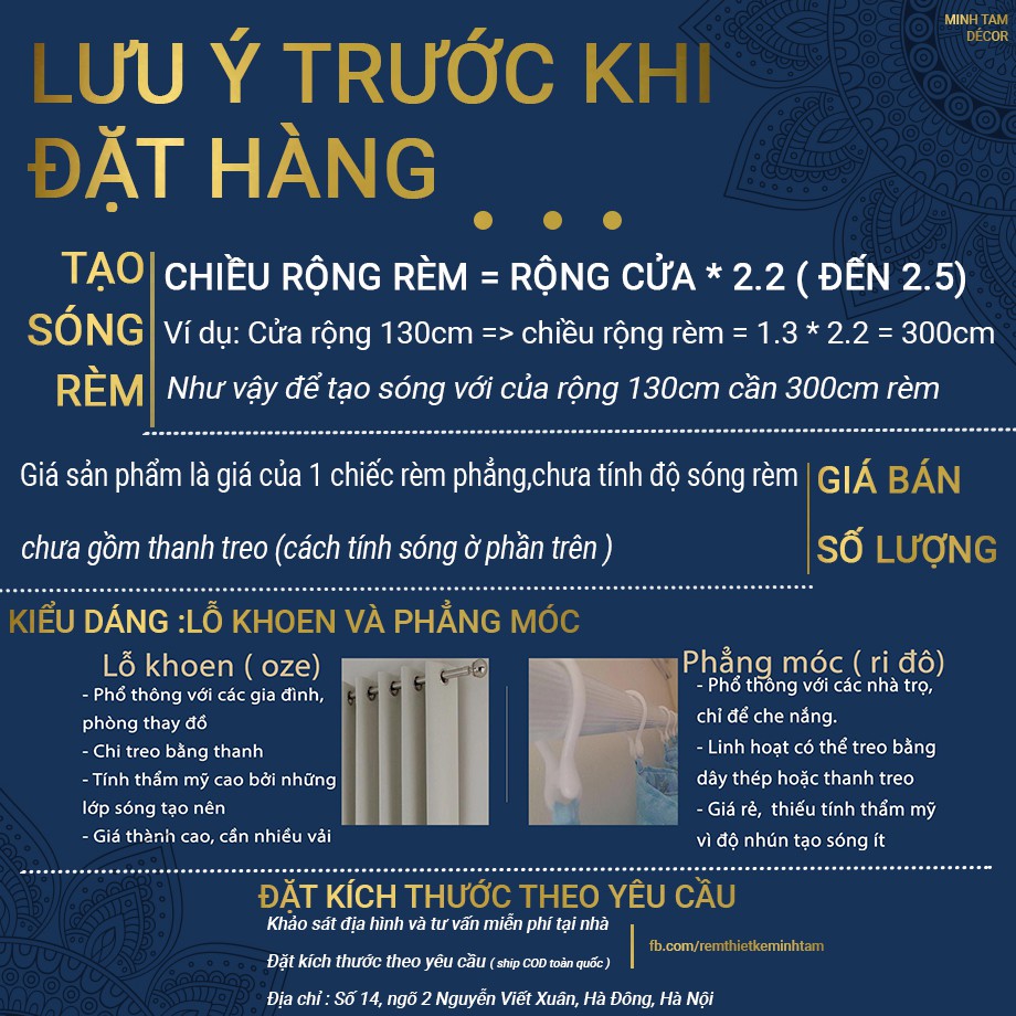( ví dụ cửa nhà bạn kích thước - rộng – 1m, dài 1.4m => nên chọn rèm : rộng 2m , dài 1,8 ( tùy vào nhu cầu của bạn muốn rèm dài đến đâu. Thông thường cách đất 5cm là đẹp) )