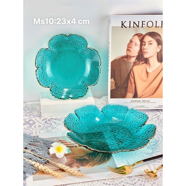 Bộ bát đĩa,chén dĩa ăn cơm,Bộ đồ ăn Thủy tinh viền vàng Màu xanh decor cao cấp