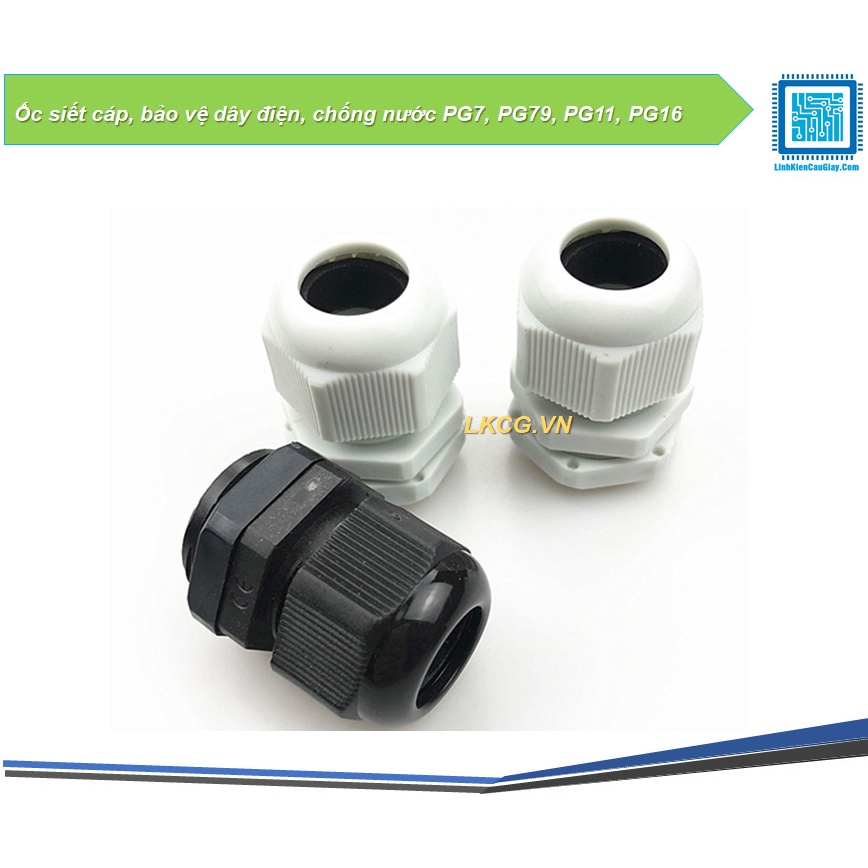 Ốc siết cáp nhựa PG7 PG9 PG11 PG13.5 PG16 PG19 PG21 PG25 PG7: Ốc siết cáp nhựa Ø12, cable 3.5-6mm PG9: Ốc siết cáp nhựa Ø16, cable 4-8mm PG11: Ốc siết cáp nhựa Ø17.9, cable 5-10mm PG13.5: Ốc siết cáp nhựa Ø20.2, cable 6-12mm Màu sắc: đen, trắng