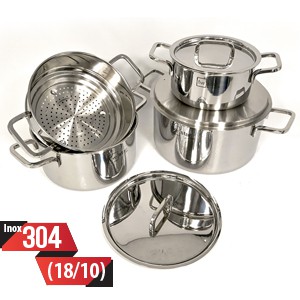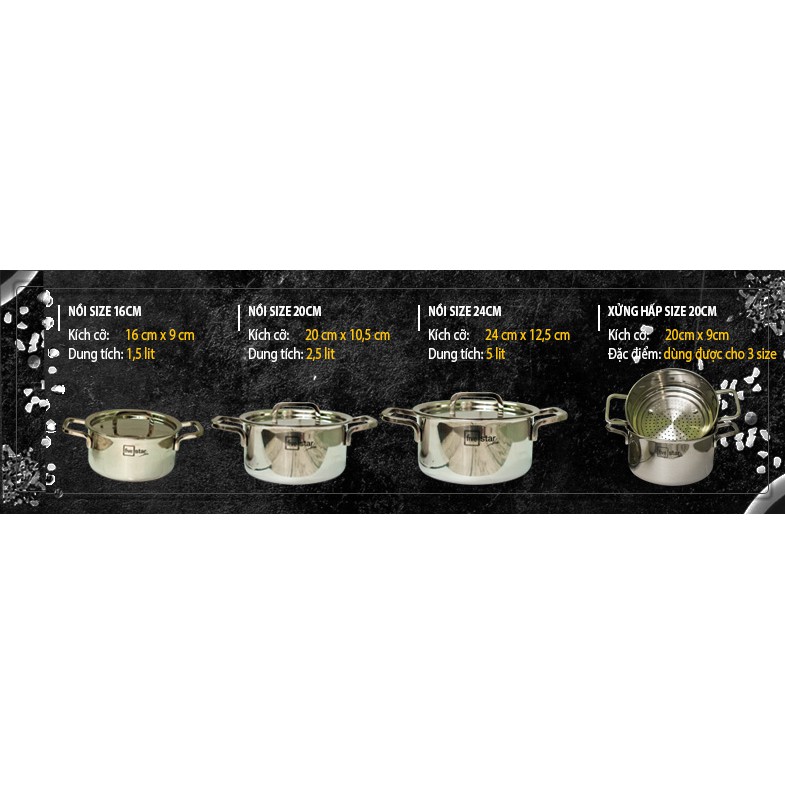 - Bộ nồi bao gồm: Nồi 16cm, nồi 20 cm kèm xửng hấp 20, nồi 24cm