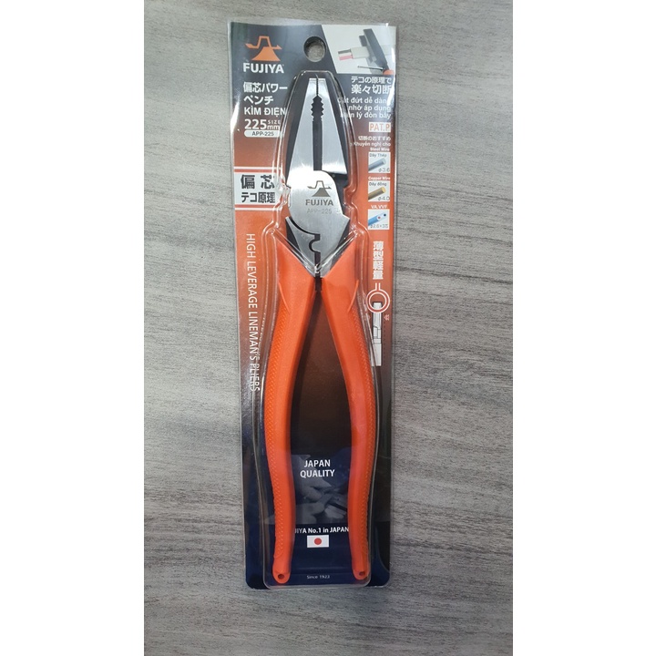 Kìm điện Fujiya APP-225 rất linh hoạt thao ở các vị trí khác nhau kể cả những nơi sâu, nhỏ hẹp. Kìm điện tác động mạnh là một dụng cụ cầm tay thông dụng và cần thiết được sử dụng phổ biến trong ngành công nghiệp, cơ khí, chế tạo, sửa chữa và lắp ráp thiết bị.