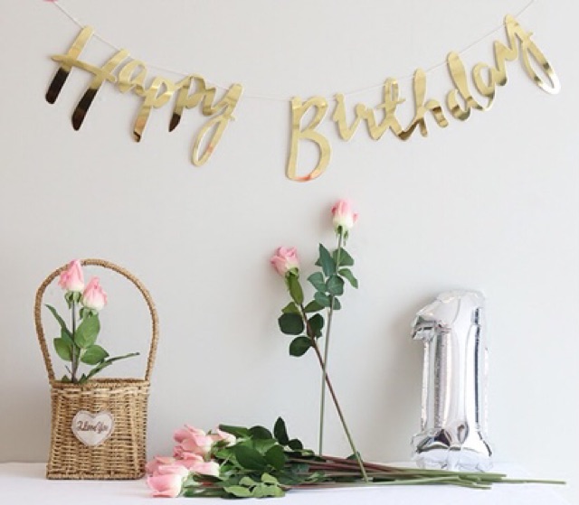•Dây chữ Happy birthday ánh kim với font chữ mảnh ấn tượng với 2 màu vàng và bạc.