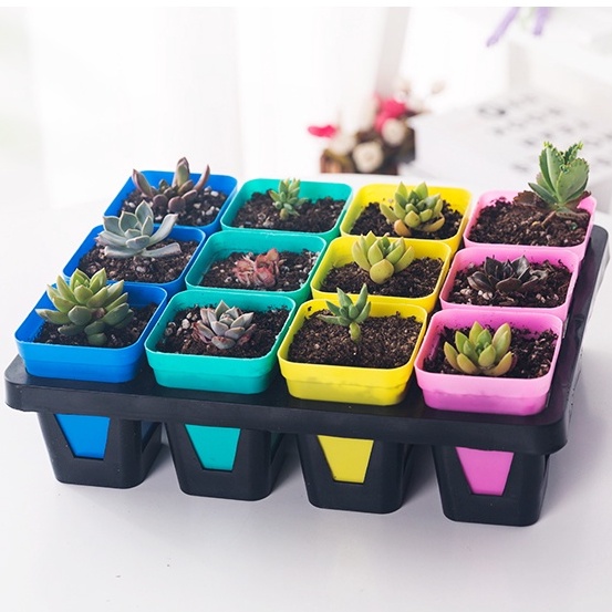 Nhà cửa & Đời sống > Làm vườn > Chậu cây || Combo Khay Ô Vuông 12 lỗ và 12 chậu nhựa vuông mix màu 7x7x8cmCòn hàng