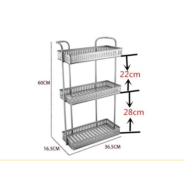 Kệ 3 tầng: cao 60,5cm; rộng 37cm, sâu 16,5cm (Khoảng cách từ tầng 1 đến tầng 2 là 27cm, T2 => T3 là 22cm)