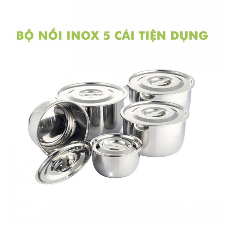 Bộ gồm 5 nồi inox có nắp đậy.