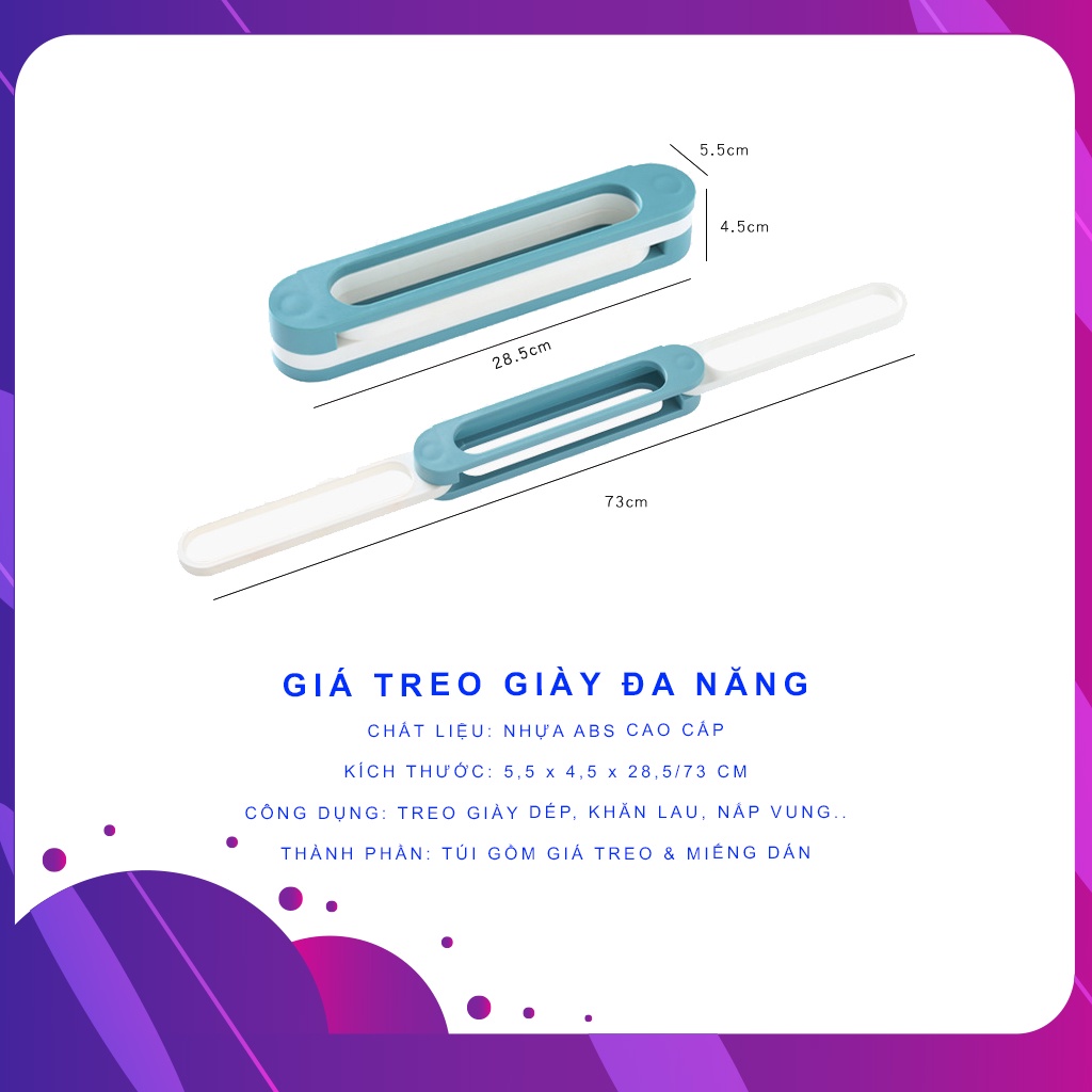 Kích thước: Chiều dài 28.5cm khi gấp gọn- treo 1 đôi dép, chiều dài 73cm khi mở ra- treo 3 đôi dép. (Vui lòng xem hình minh họa). Chiều rộng 5.5cm. Chiều cao 4.5cm.