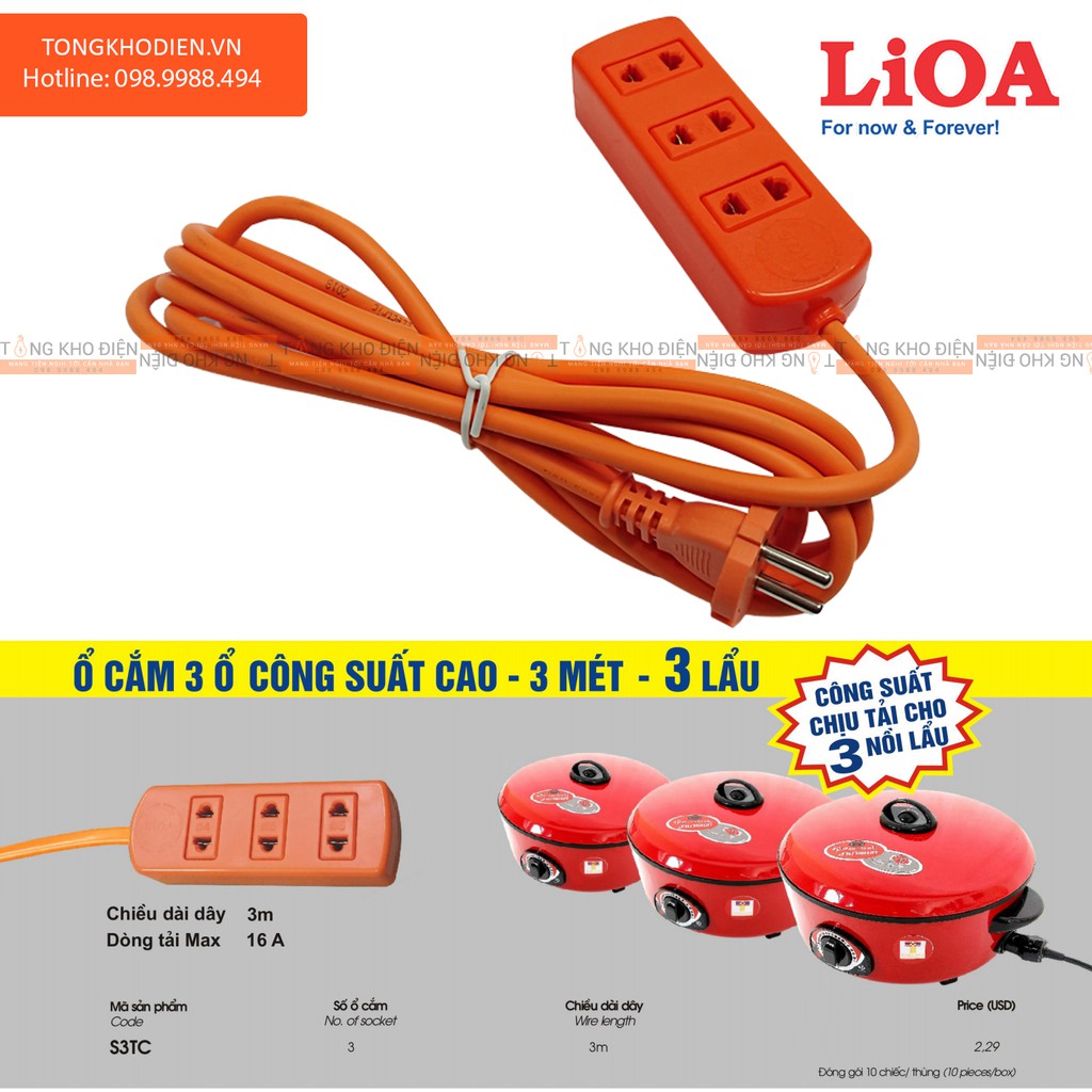 Giới thiệu Ổ cắm điện LIOA 3 ổ Công suất lớn chịu tải 3 nồi lẩu S3TC 3m