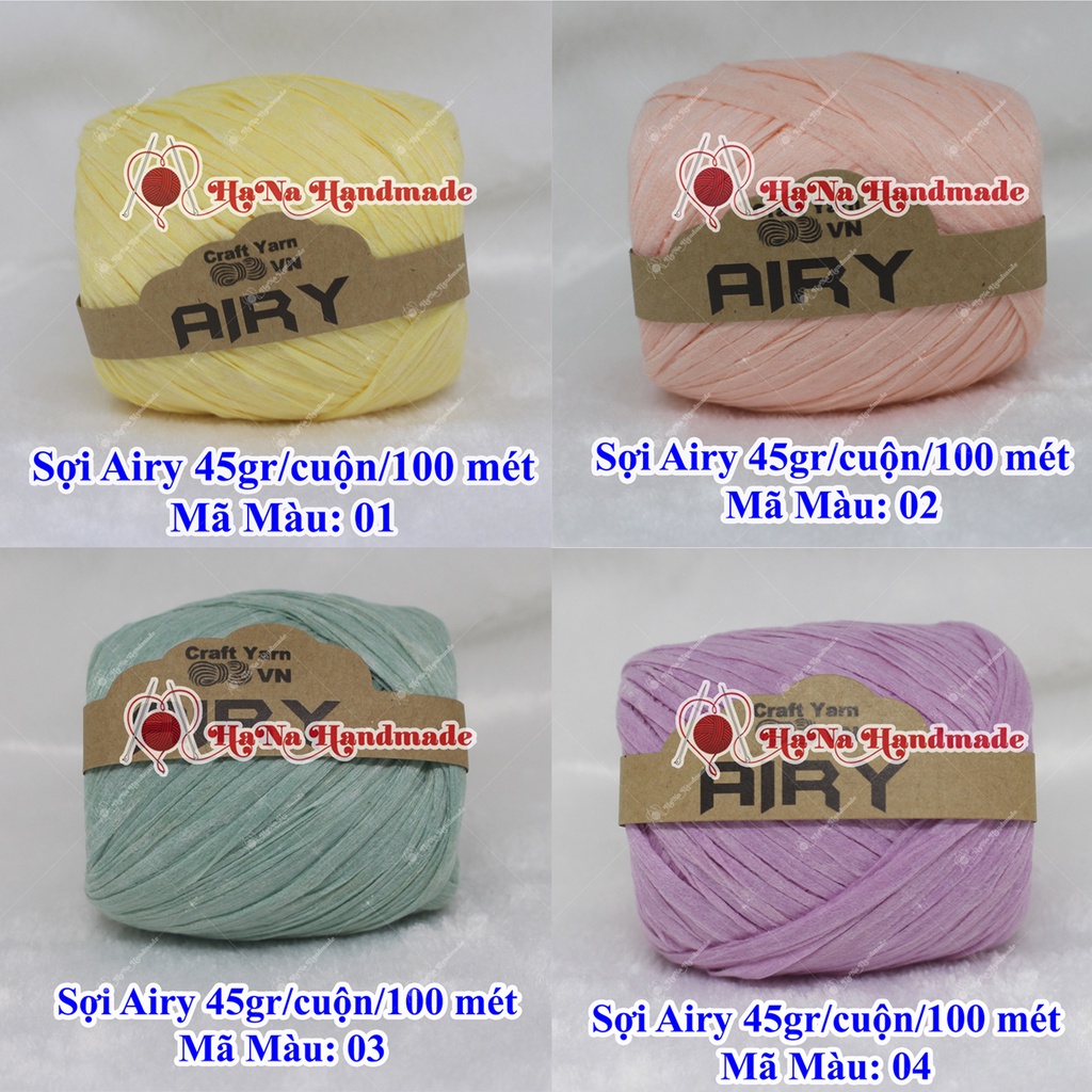 Sợi AirySợi được sản xuất bởi công ty Craft Yarn của Việt Nam, sợi được pha trộn giữa viscose và polyester, sợi mềm nhẹ và có độ loang nhẹ phù hợp dùng làm các sản phẩm túi xách, mũ nón mùa hè, hoặc có thểm làm thảm trang trí tùy vào nhu cầu sử dụng của khách hàng nha.