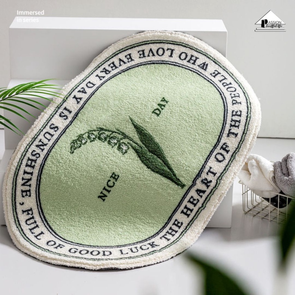 Sở hữu form dáng bầu dục, Thảm Lau Chân mới của Nhà còn được khoác lên một chiếc áo siêu retro khi có phần đường viền chữ font vuông cổ điển. Bên cạnh đó là nét mộc mạc của họa tiết thiên nhiên: lá cọ, nhành hoa chuông, những bông cúc và đặc biệt hơn hết là những gam màu trendy: Trắng đen, Xanh mint, Cam phối Trắng, không quá nổi bật và rất dễ để mix&match với những đồ dùng nội thất khác trong không gian sống.