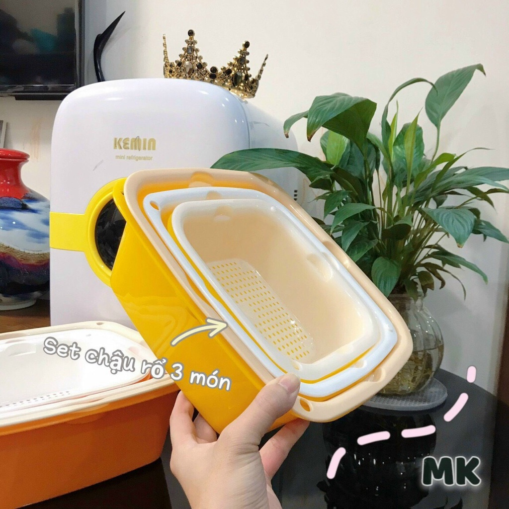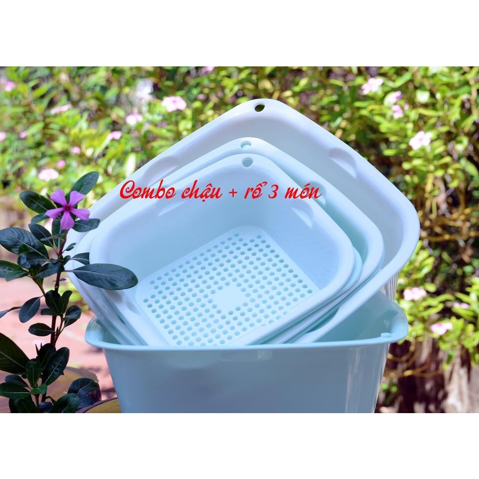 - 1 set gồm 3 chậu và 3 rổ với kích thước lớn nhỏ khác nhau, phù hợp với từng nhu cầu sử dụng như đựng các loại trái cây, rau củ hay thực phẩm cho gia đình.- Bề mặt rổ rửa được thiết kế với những chiếc lỗ, giúp thoát nước nhanh chóng, dễ dàng hơn.
