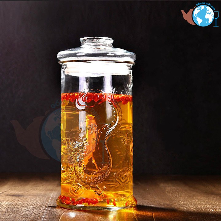 Bình thủy tinh trụ có hoa văn hình con rồng hoàn toàn phù hợp với mục đích sử dụng của gia đình bạn.