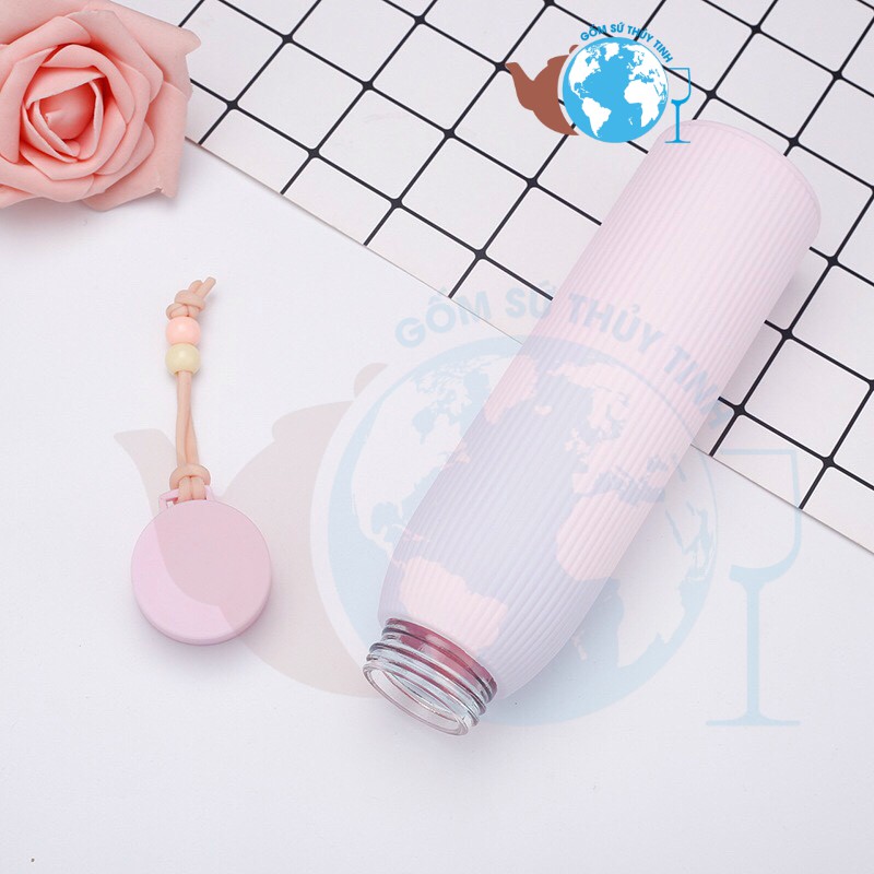**** Bình nước có nắp đậy vặn xoáy bằng nhựa silicon có ron kín hơi 100%, trong là thủy tinh trong suốt được bọc bởi lớp vỏ bọc bình bằng silicon, màu rất dễ thương, không chứa các chất độc hại cho sức khỏe.