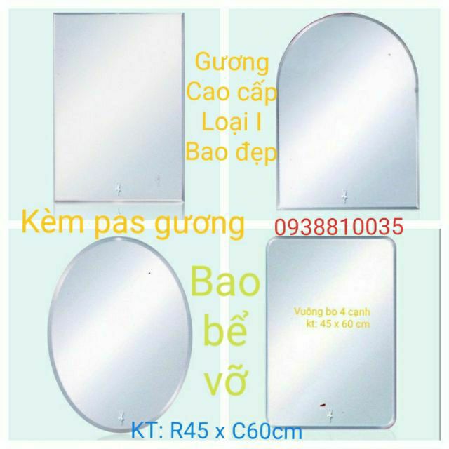 Bộ sản phẩm gồm: 1 gương và 1 bộ pas kiếng (ốc vít, tắc kê) hoặc keo dán gương