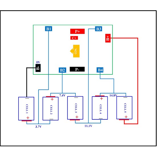 - Đấu dây: Hàn theo thứ tự B-(0V) , B1(3.7V), B2(7.4), B3(11.1V), B4(14.8V) và B+(18V)