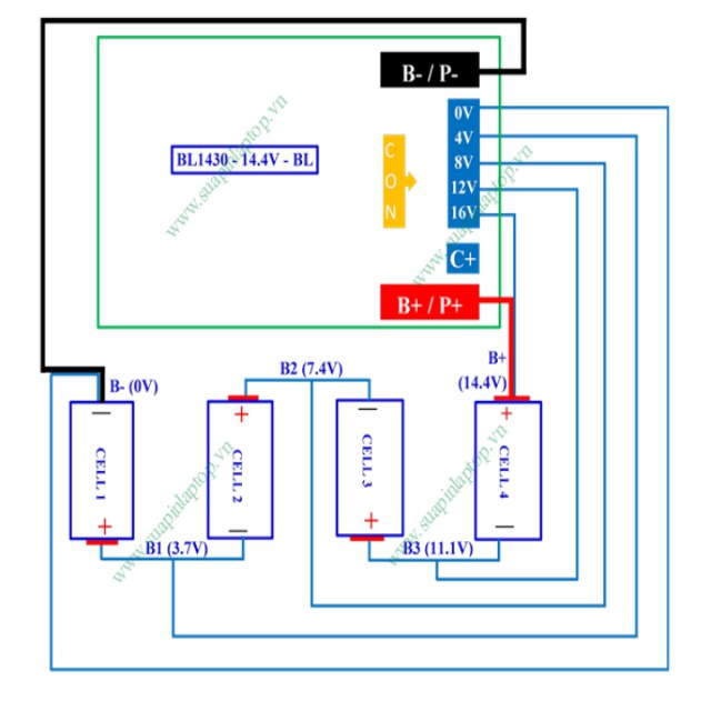 - HD đấu mạch sạc CB: Trên mạch, hàn lần lượt, theo thứ tự từ B-, 4V, 8V, 12V và B+ và pack pin 0V(B-), 3.7V(B1), 7.4V(B2), 11.1V(B3) và 14.8V(+B4). Kế đến: Nối đường 16V (trên mạch, đang bỏ trống) vào B+.
