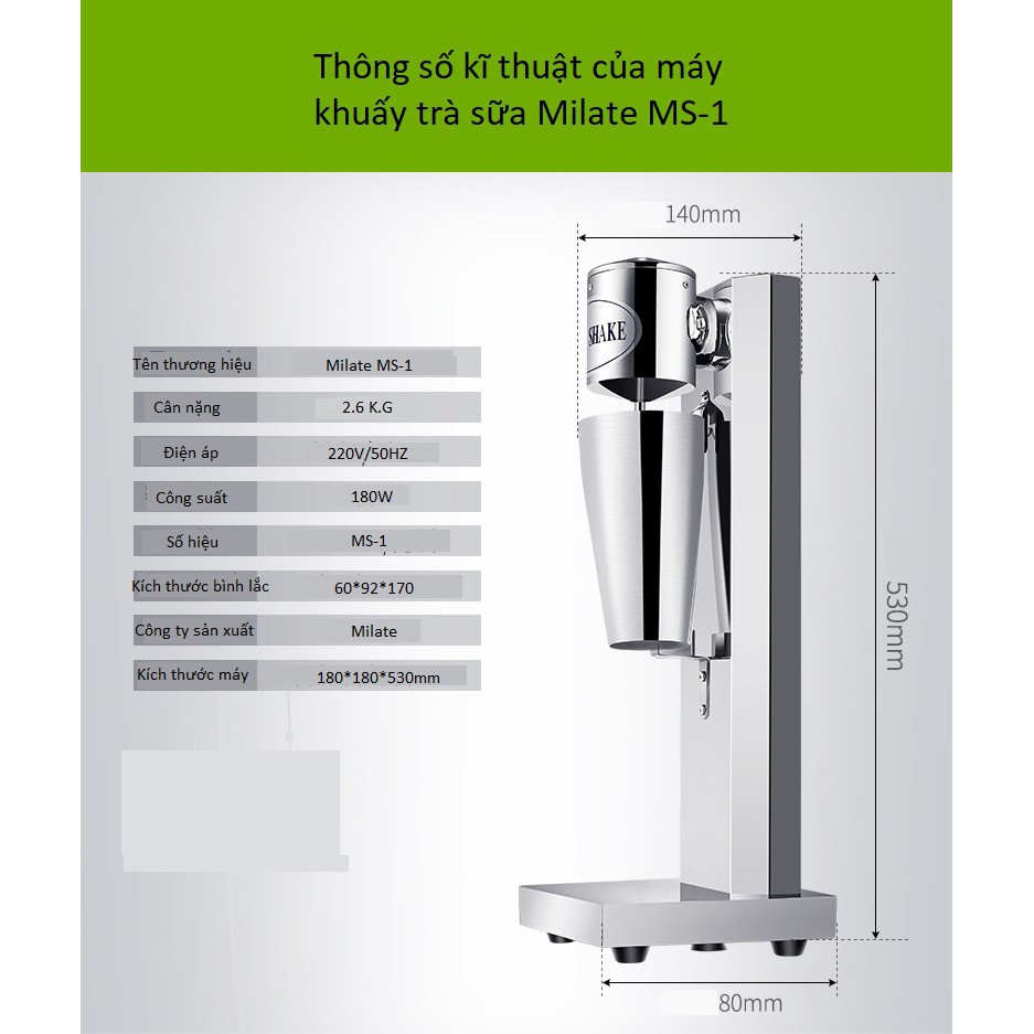 Được sản xuất bởi công ty Milate chuyên các dòng sản phẩm điện tử gia dụng và các sản phẩm sử dụng trong lĩnh vực pha chế đồ uống. Máy khuấy trà sữa Milate MS-1 được sản xuất để khuấy trà sữa, làm trà lắc, làm kem trứng hoặc làm các sản phẩm tuyết xay thay cho công đoạn shake lắc thông thường. Máy phù hợp với với các quán cà phê, trà sữa, đồ uống quy mô lớn. Sử dụng máy sẽ giúp tiết kiệm thời gian hơn so với việc shake lắc thông thường. Đồng thời các sản phẩm sử dụng máy khuấy lắc Milate MS-1 sẽ cho ra chất lượng đồng đều hơn.Dễ dàng tháo lắp bình sau sau khi sử dụng. Mắc cài giữ bình chắc chắn khiến cho bình lắc không rơi, tuột trong quá trình làm việc.