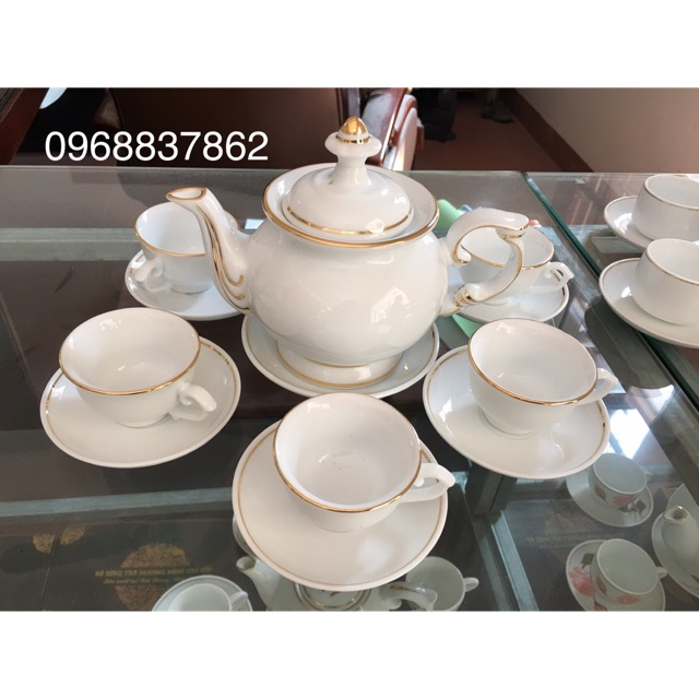 Bộ phú quý men trắng vẽ chỉ vàng kim đơn giản mà sang trọngBộ bao gồm 1 ấm 6 chén và 7 đĩa lót