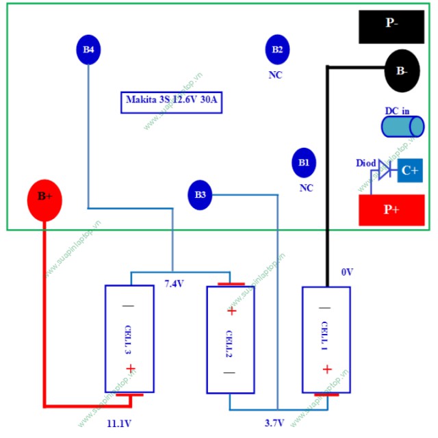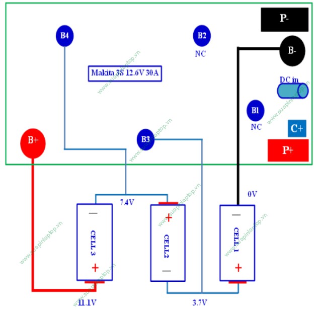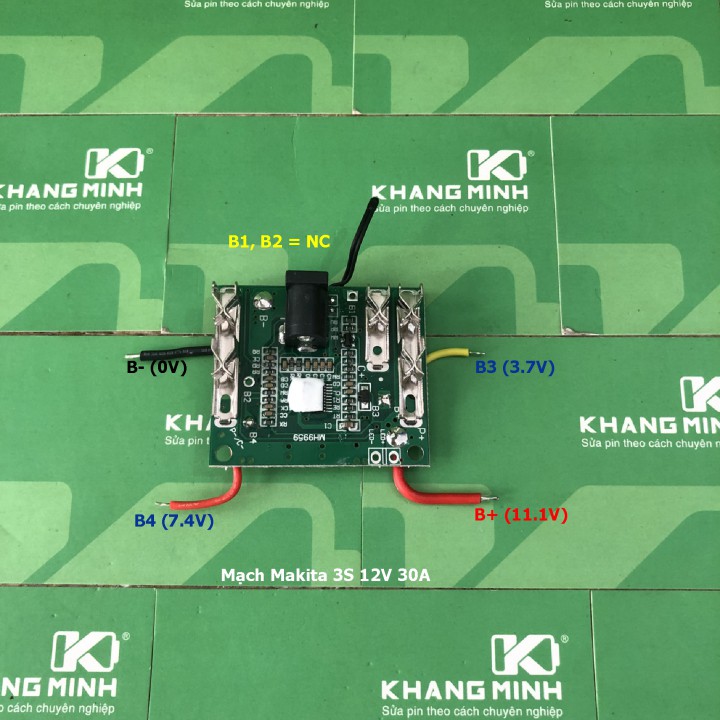 - Cách đấu mạch: Hàn theo đúng thứ tự B- (0V), B3(3.7V), B4 (7.4V) và B+ (11.1V). Đường B1 và B2 bỏ trống (Bắt buộc vậy! Đó là đặc điểm riêng của mạch này!)