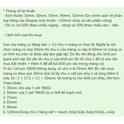 - Cách tính size khi mua: Size của màng co đăng bán = 1/2 chu vi màng co thực tế. Nghĩa là, khi chọn màng co size 30mm thì chu vi của màng co này là 60mm (vì màng co có hình trụ tròn và được xếp làm gấp lại). Do đó, khi đóng cho khối pin (pack pin) nào thì cần đo chu vi của khối pin đó rồi chia 2 để có size cần mua (tất nhiên + thêm ít để dễ bỏ khối pin vào trong màng co).