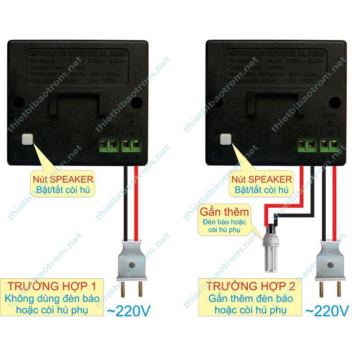 - Điều chỉnh được độ nhạy. Có thể nối thêm còi hoặc đèn báo phụ
