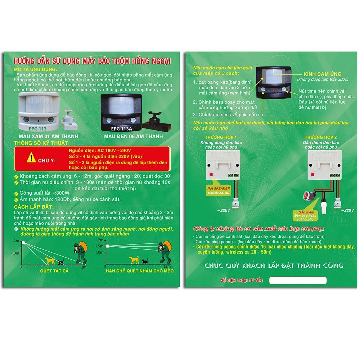 - Có công tắc tắt/ mở loa sau thiết bị ( nút Speaker ), có thể đấu song song với đèn phụ để sử dụng chiếu sáng khi có báo động