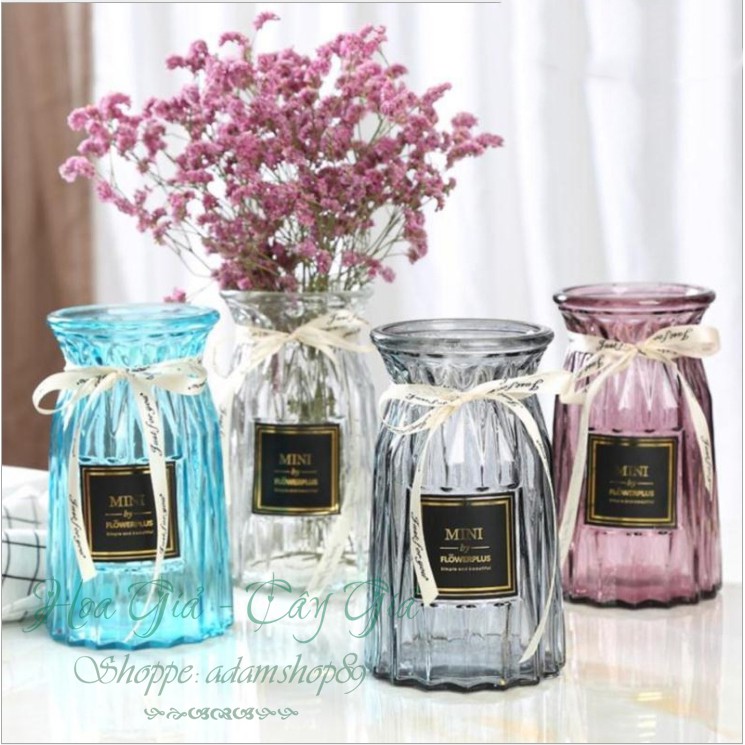 Bình cắm hoa thủy tinh thắt nơ phong cách châu Âu dùng cắm hoa tươi, hoa giả trang trí phòng...Chất thủy tinh mịn với màu sắc trang nhã dễ cắm nhiều loại hoa.