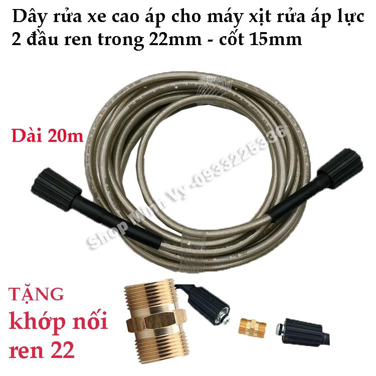 Dây cao áp bố vải dùng cho máy rửa xe.Ren trong 22, dùng cho 80% các loại máy rửa xe trên thị trường.