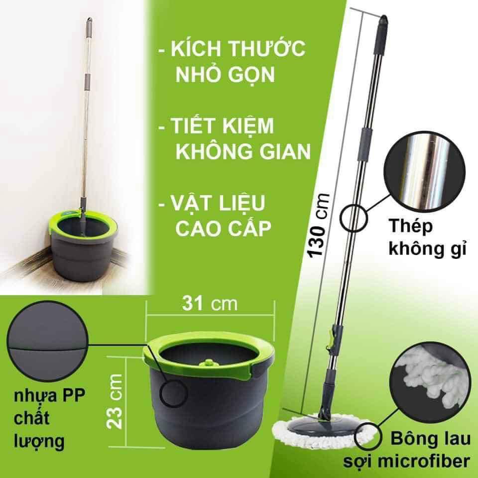 - Với trụ đứng có thể nâng lên, hạ xuống ở giữa thùng giặt, bạn vừa có thể giặt bông lau (khi trục hạ xuống), vừa có thể vắt khô nhanh chóng (khi trục nâng lên cao) ngay trong một thùng giặt, tiện lợi khi sử dụng. Thùng giặt không to, không chiếm diện tích sàn, tiết kiệm không gian.
