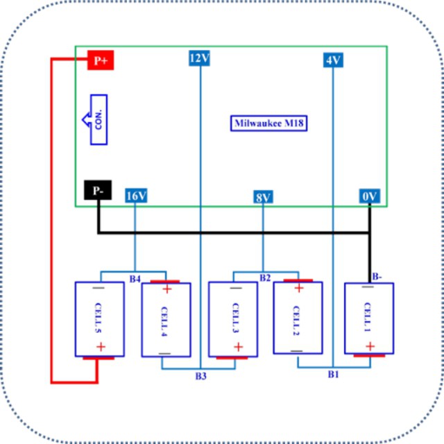 - Cách đấu mạch: Hàn lần lượt, theo thứ tự từ B- (0V), 4V (B1), 8V (B2), 12V (B3), 16V (B4) và B+ 18V