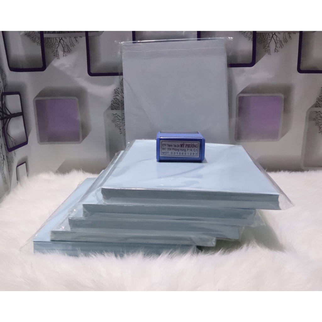 Đóng gói: Giấy decal đế xanh được đóng gói 100 tờ trong 1 xấp.
