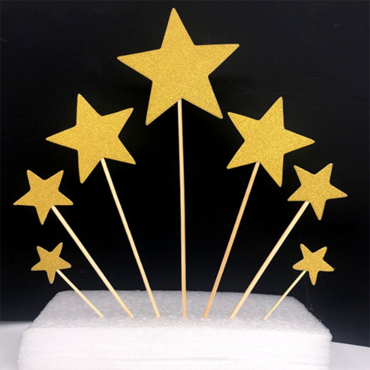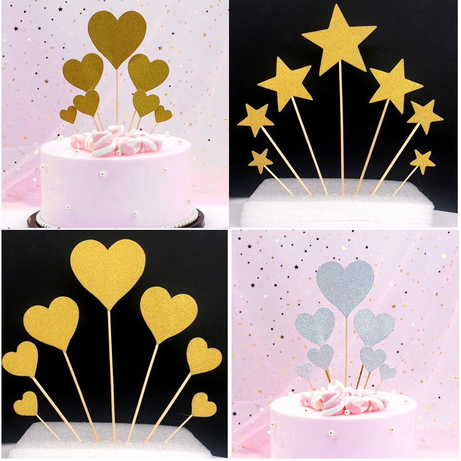 Set 7 hình tim sao nhũ cắm bánh sinh nhật, hình cắm nhũ
