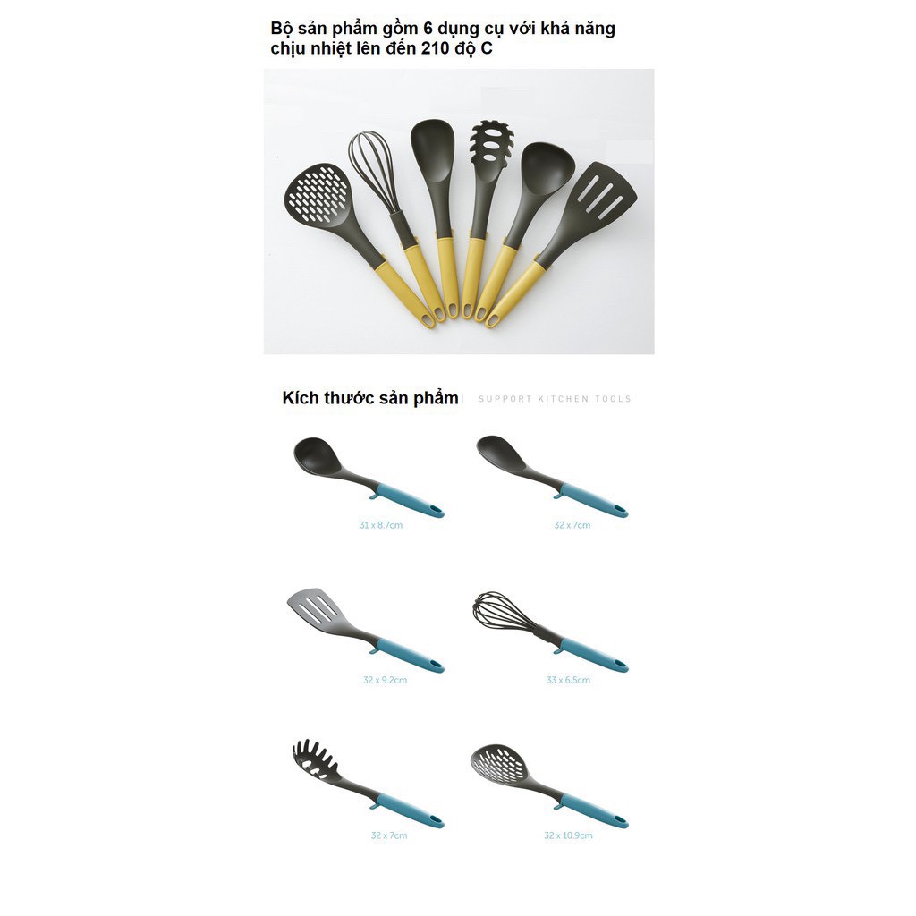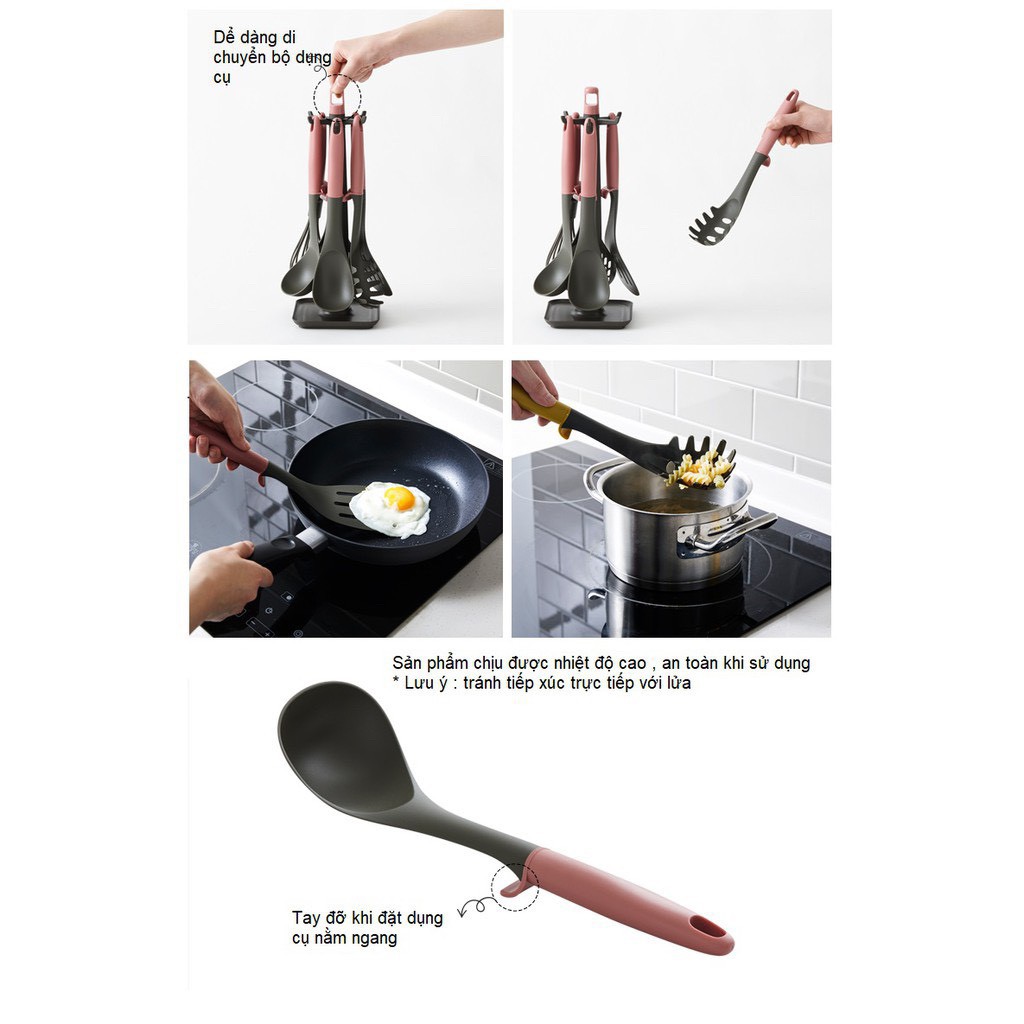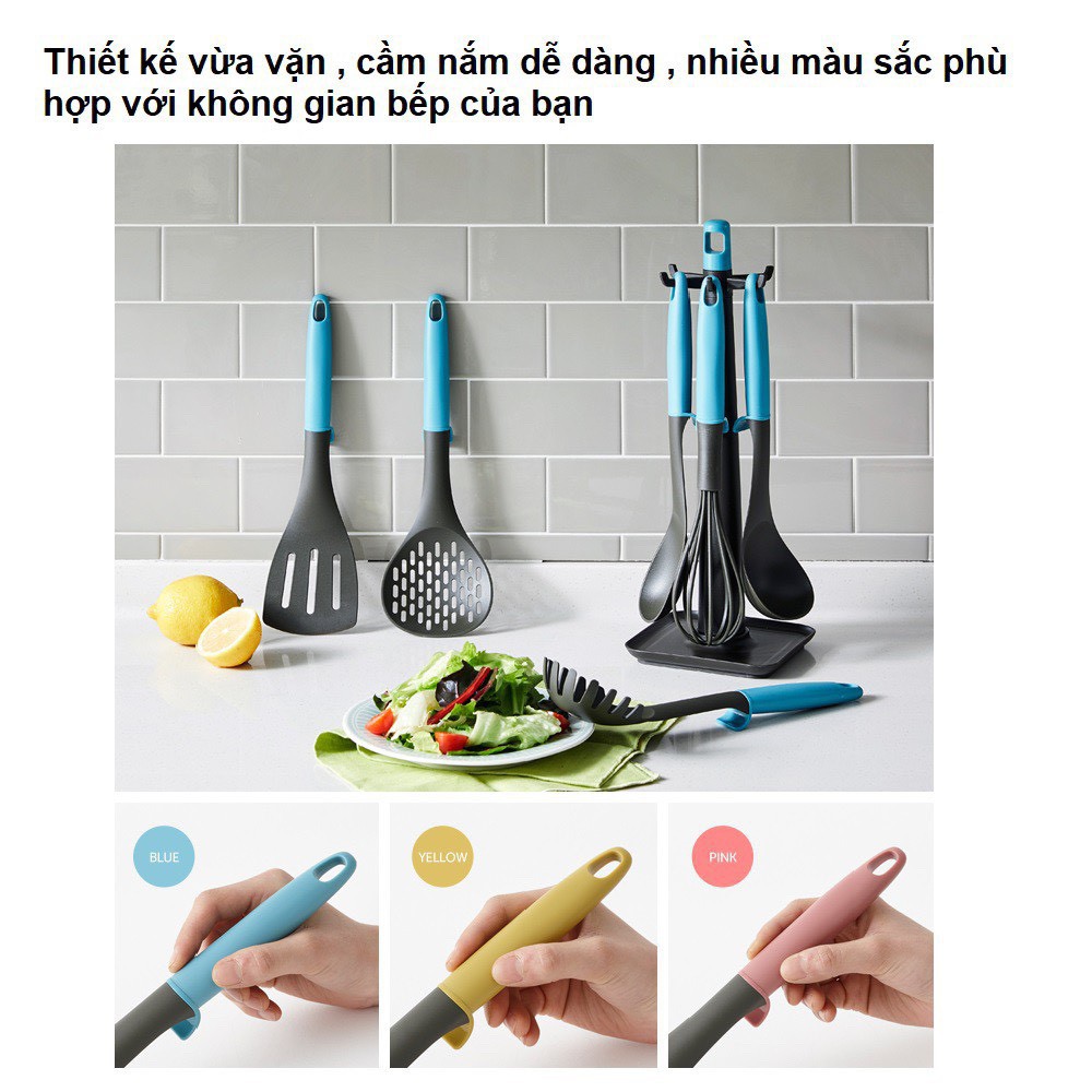 - Gồm 7 chi tiết được làm bằng nhựa bền bỉ được làm từ chất liệu nhựa bền chắc, có khả năng chịu nhiệt tốt, an toàn khi nấu nướng mà không làm ảnh hưởng đến chất lượng món ăn cũng như cho sức khỏe của người sử dụng.- Thiết kế đế treo tiện lợi , tay cầm từng món vừa vặn, chống trơn trượt giúp bạn thực hiện các công việc nấu nướng được dễ dàng hơn. Bề mặt các sản phẩm sáng bóng, ít bám dầu mỡ hay mùi thức ăn nên rất dễ vệ sinh sau khi sử dụng.