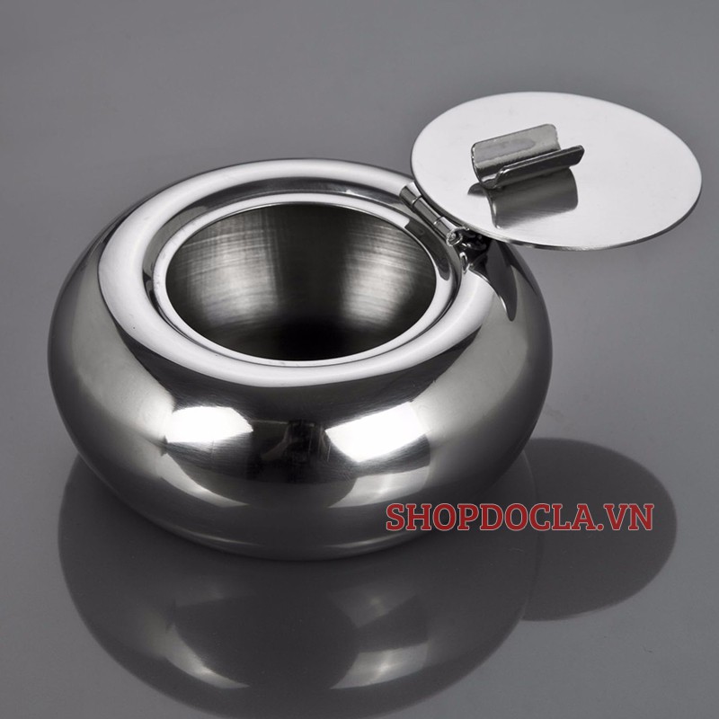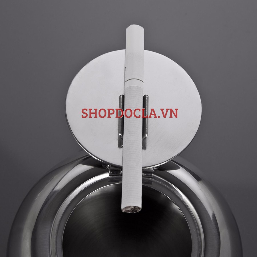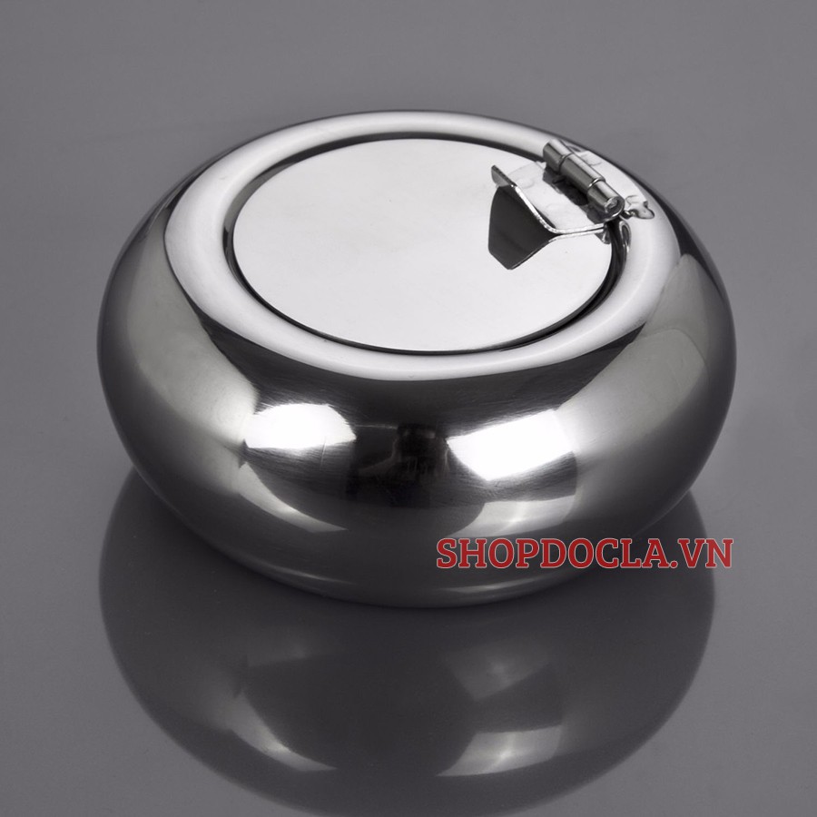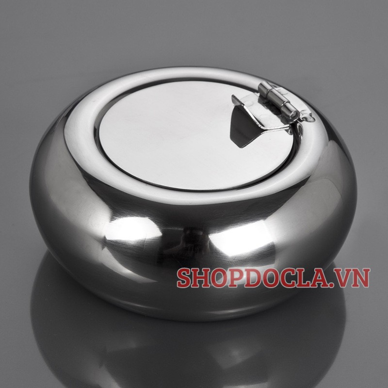 Gạt tàn thuốc bằng thép không gỉ hình trống có nắp tiện dụngKích thước : đường kính 10 cm, cao 5 cm