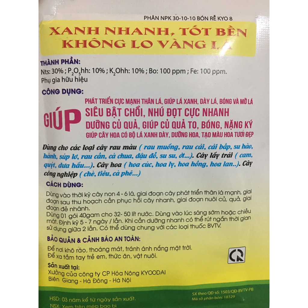 Phân bón lá NPK 30-10-10 nở bụi, xanh lá, mập cọng 40gr, xanh lá, mập mầm