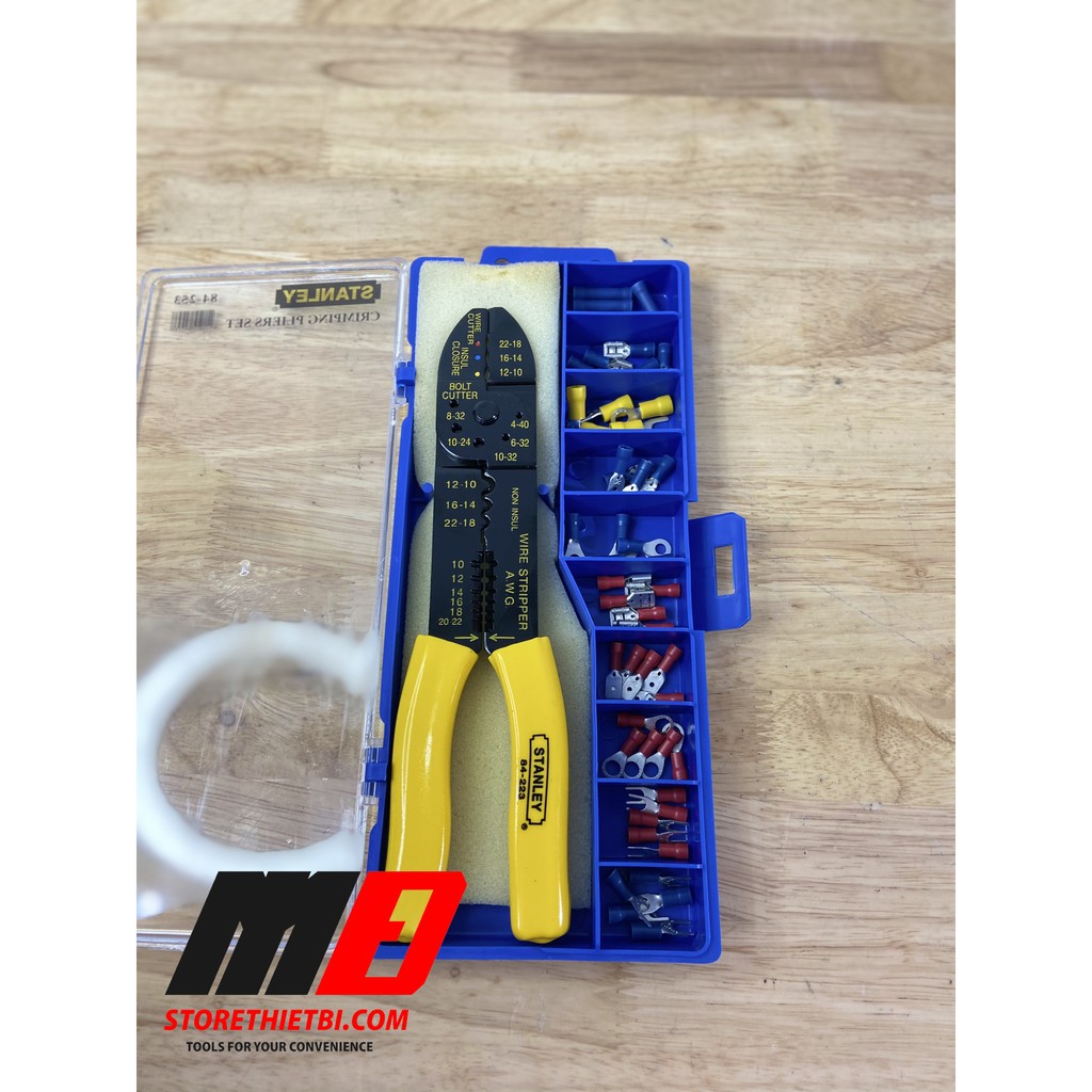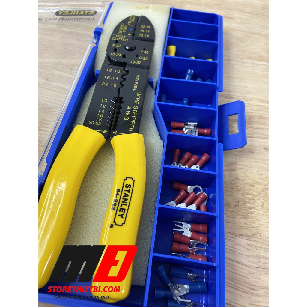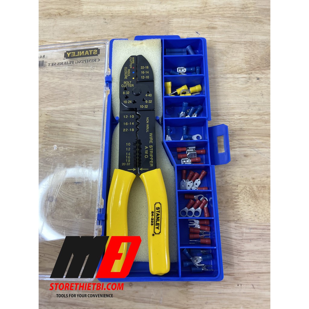 - Kềm bấm COS 9 inch/230 mm STANLEY 84-253-22.- Hộp nhựa có khay đựng các đầu cosse.