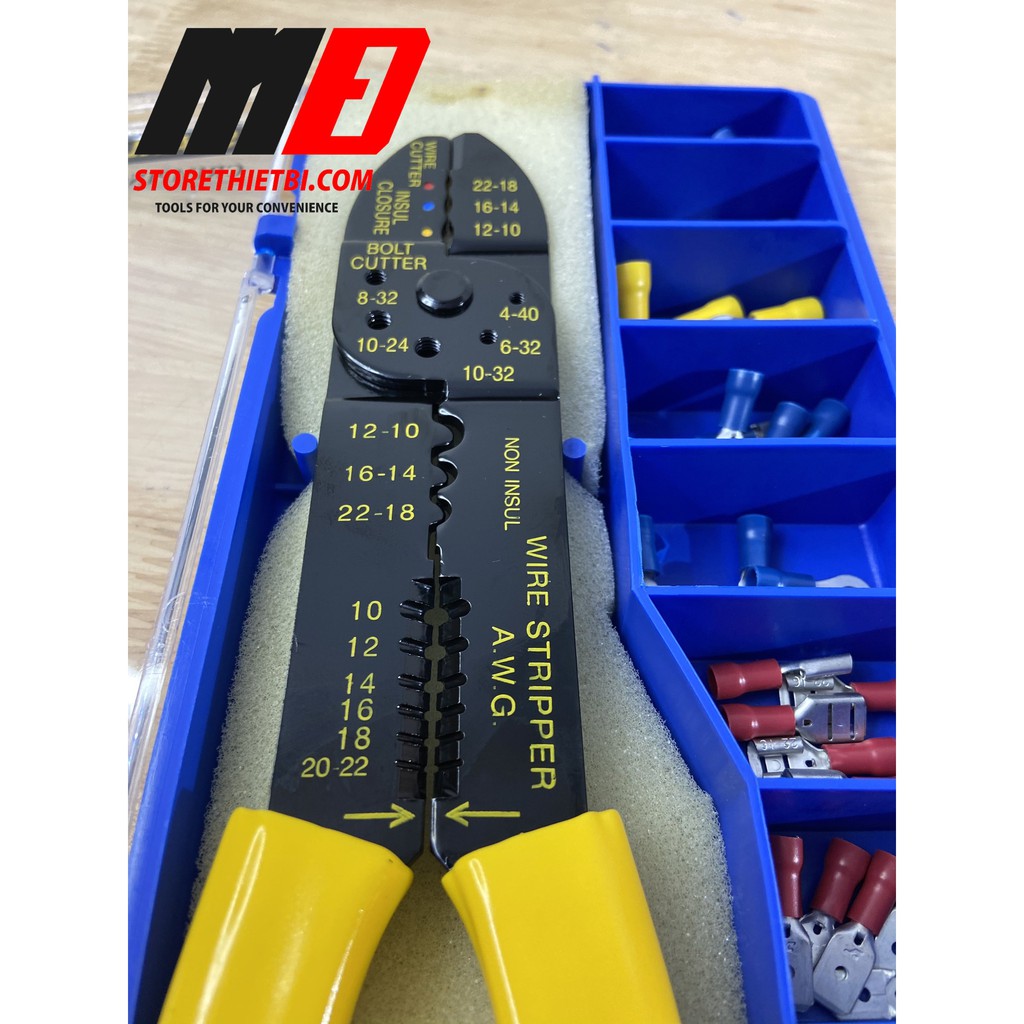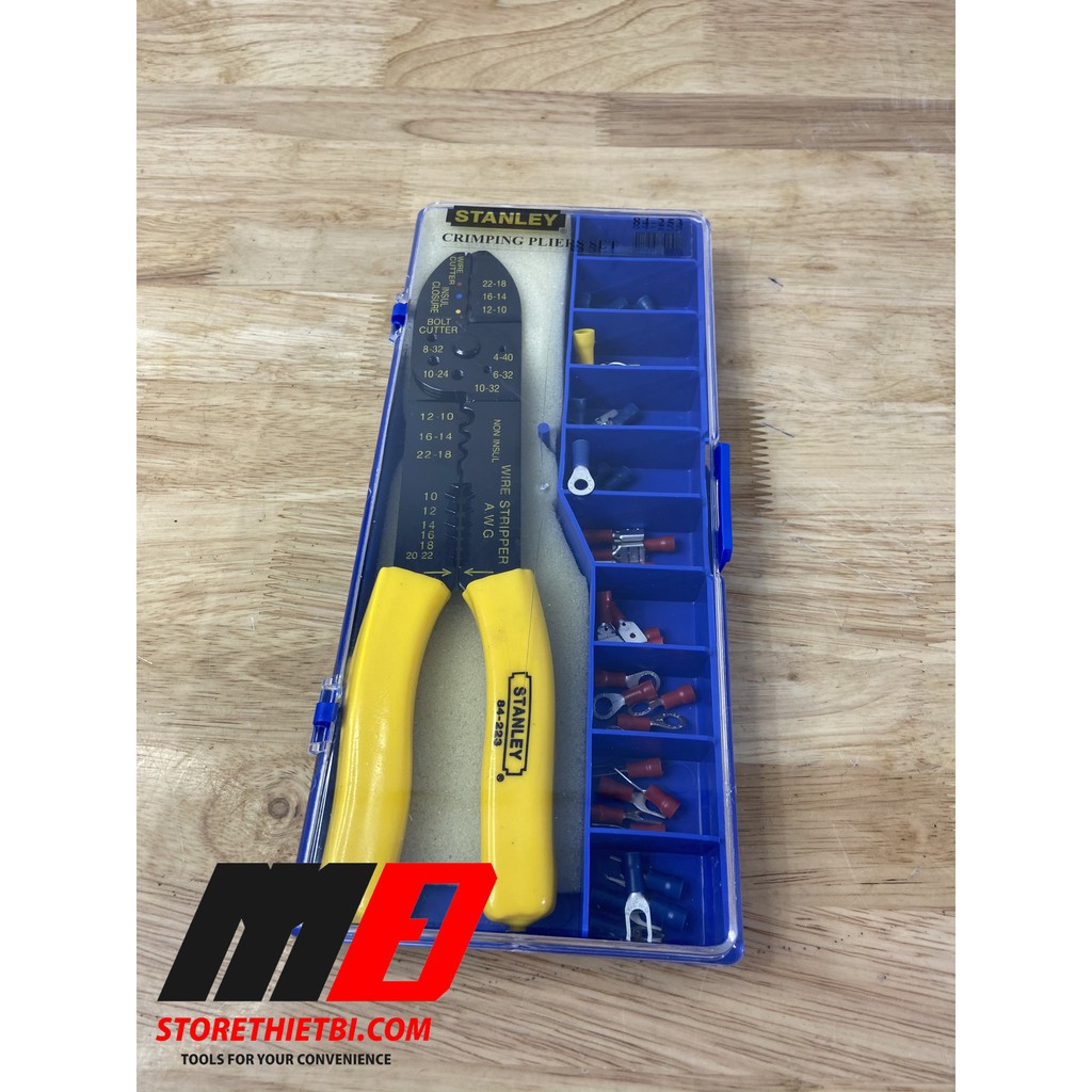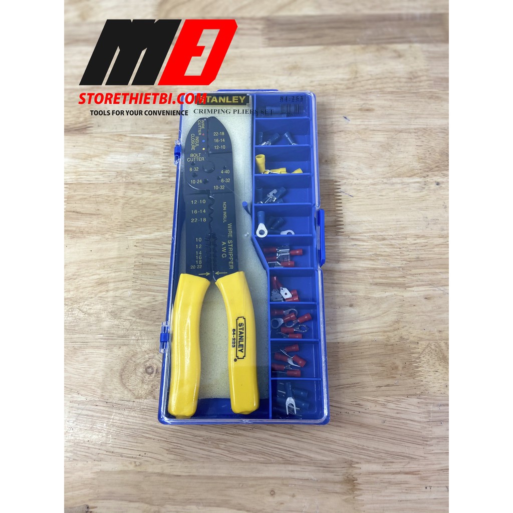 - Kềm bấm COS 9 inch/230 mm STANLEY 84-253-22.- Hộp nhựa có khay đựng các đầu cosse.