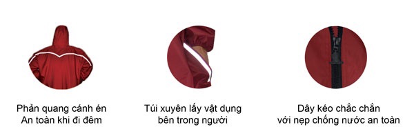 Áo Bisur dây kéo gọn gàng và thời trang nhất khi di chuyển. Với thiết kế bít sườn nhằm bảo vệ an toàn, không bị nước tạt từ 2 bên. Mặc sau áo là viền phản quang hình cánh én giúp tương phản ánh sáng khi đi đêm, áo còn trang bị túi xuyên giúp người mặc có thể thao tác nhanh để lấy vật bên trong bộ trang phục chính. Ngoài ra, với lớp nẹp chống nước và dây kéo chắc chắn người mặc sẽ được che kín hơn và không sợ bị nước chảy vào trong áo.Chức năng chuyên biệt:
