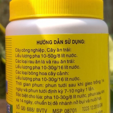 Pha từ 5gr đến 10gr cho 1 bình 8L, phun đều trên lá, thân cây và xung quanh gốc.
