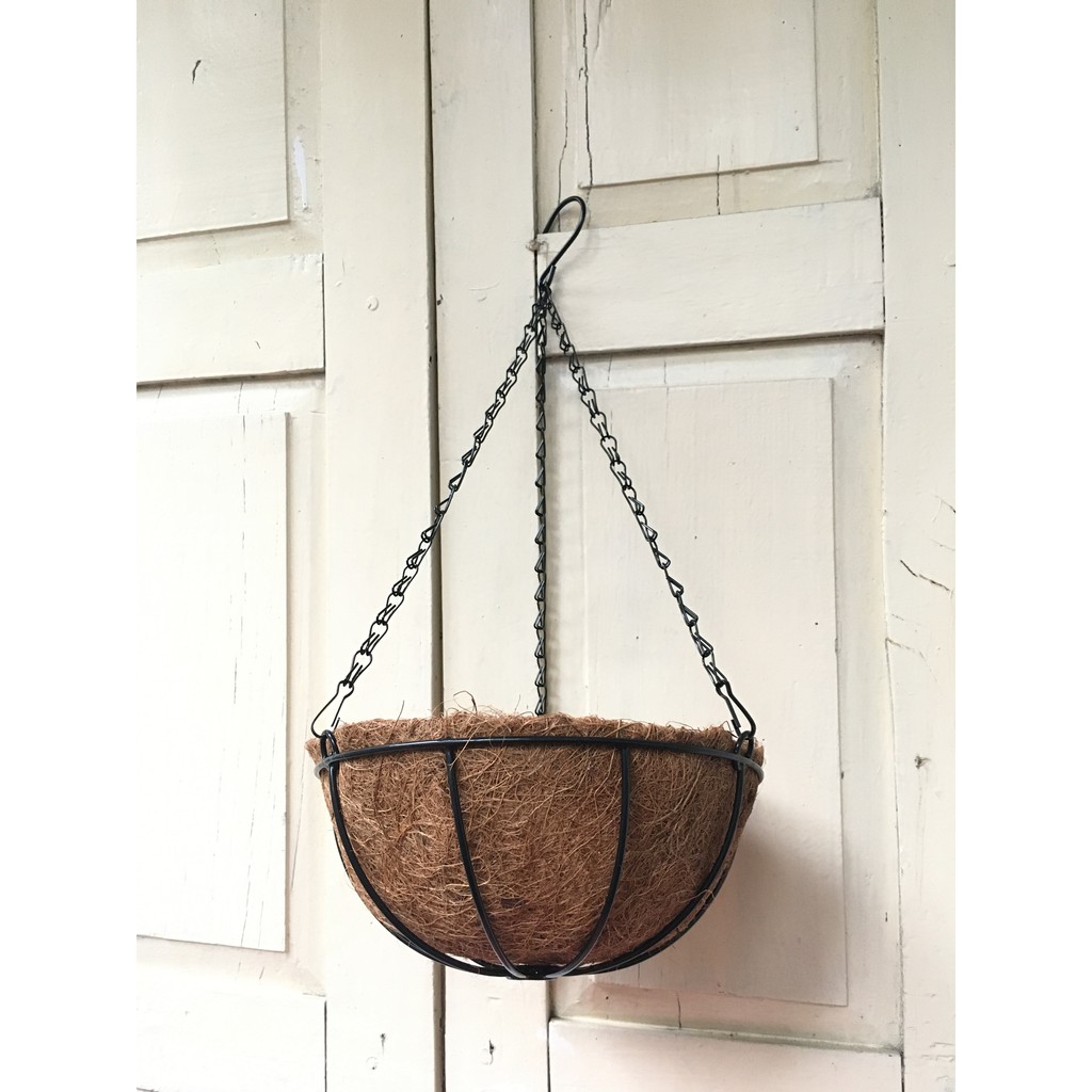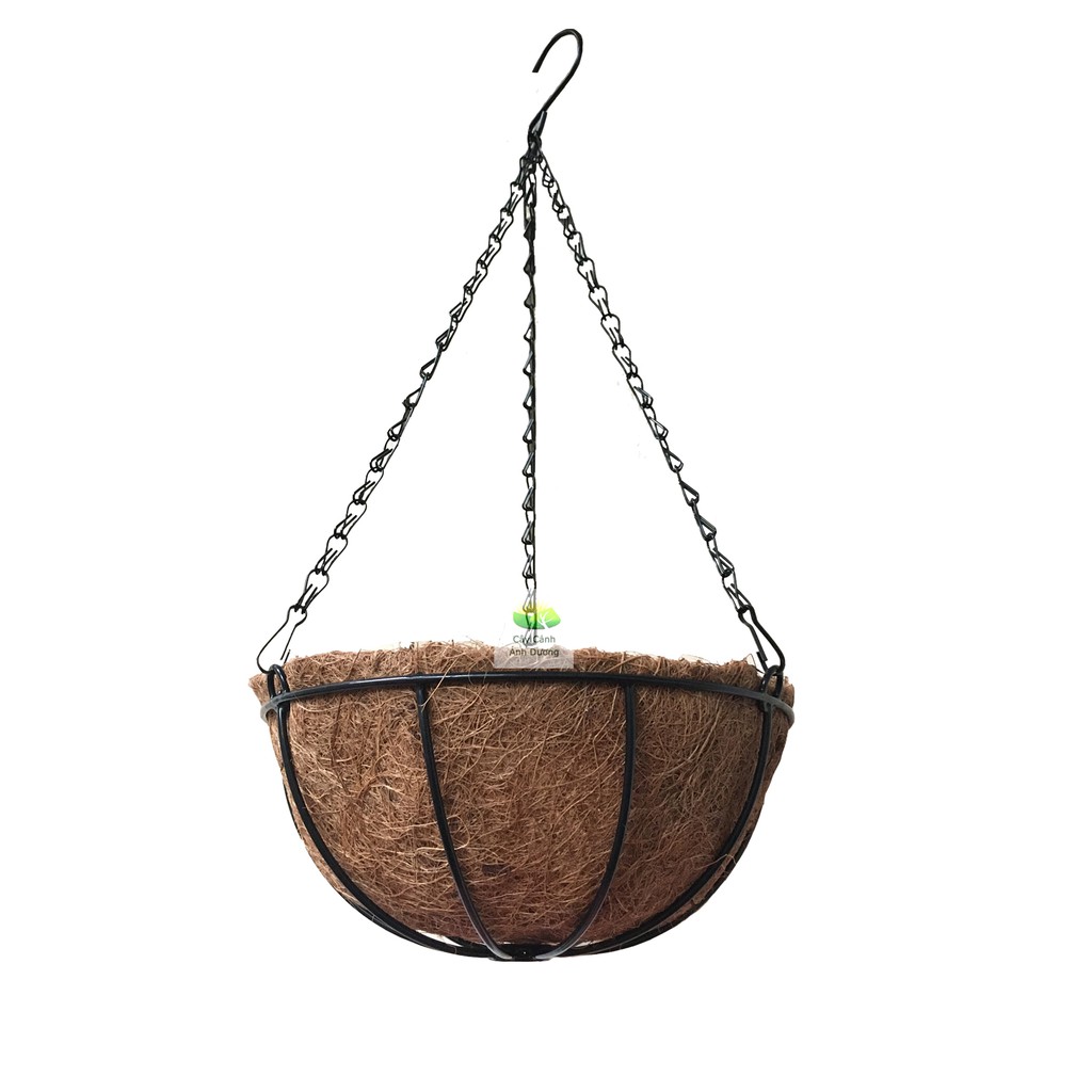 Chậu treo xơ dừa khung đen, bao gồm dây treo sắt phun sơn màu đen như hìnhThích hợp trồng lan, trồng cây hoa cảnh rủ, lớp lót xơ dừa giúp thoát nước tốt.