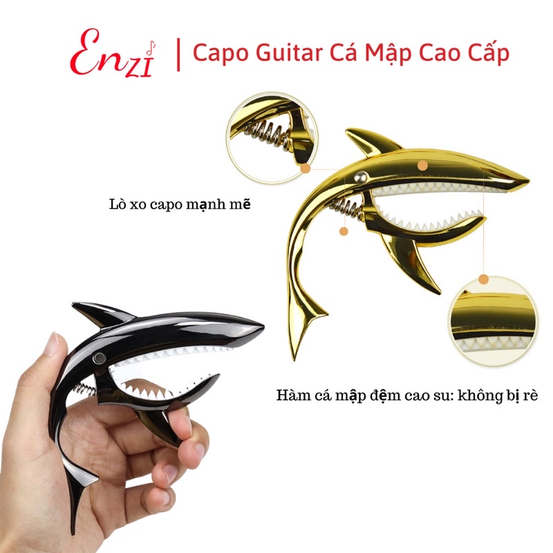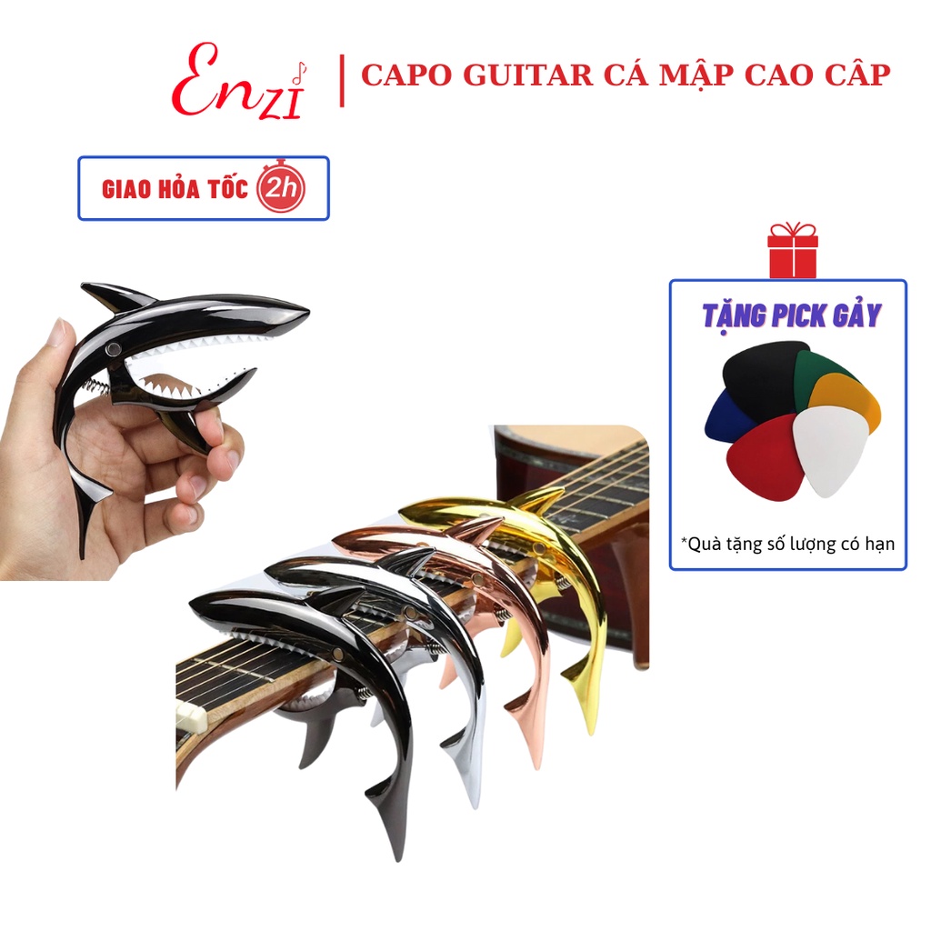Kẹp Capo guitar cá mập cao cấp dành cho đàn ghita acoustic, guitar classic màu đen bạc vàng đồng hồng bạc mờ EnziCapo guitar cá mập classic acoustic là một vật dụng vô cùng cần thiết cho các guitarist, vậy hẳn các bạn đã không xa lạ gì với các chủng loại capo bình thường có mặt trên thị trường bây giờ.