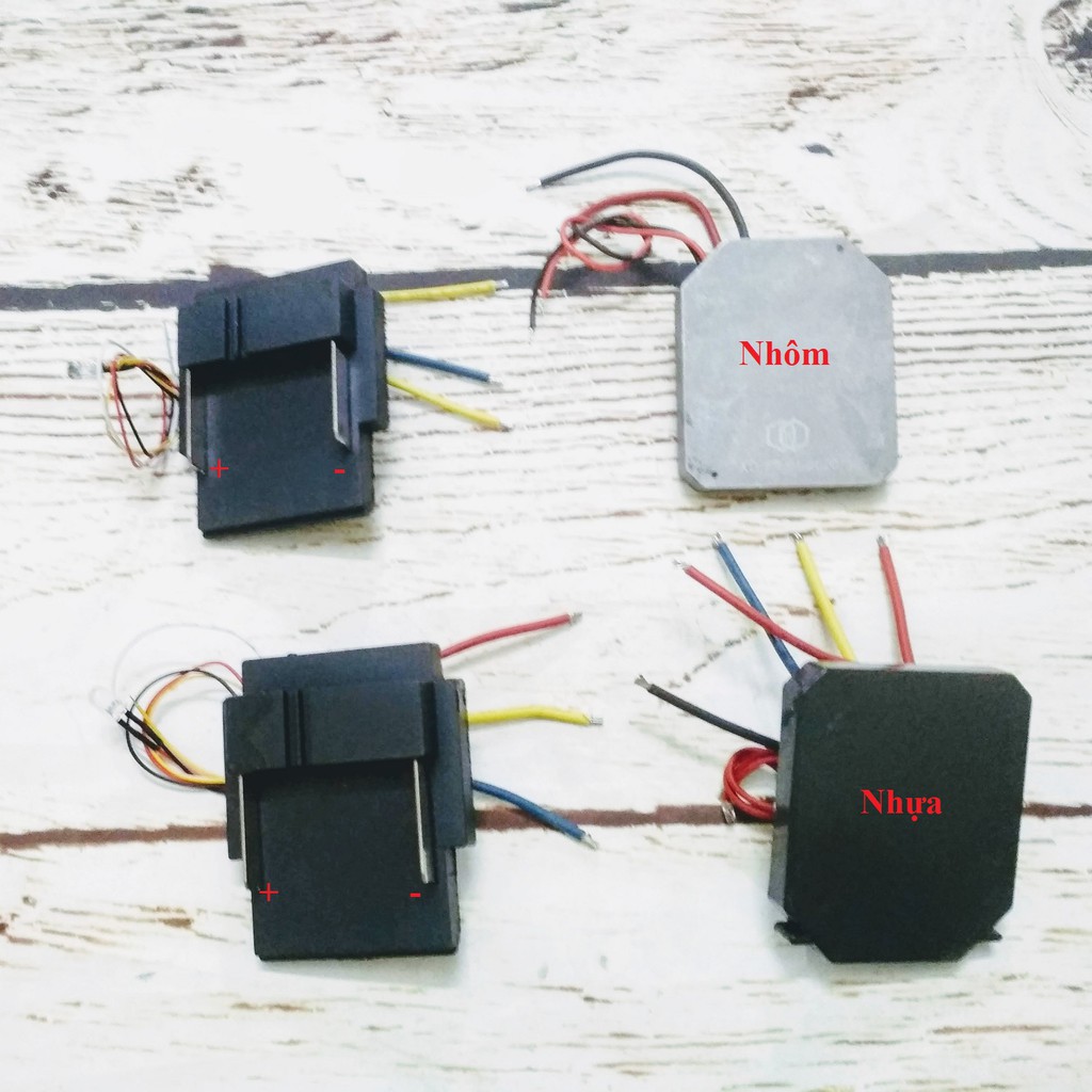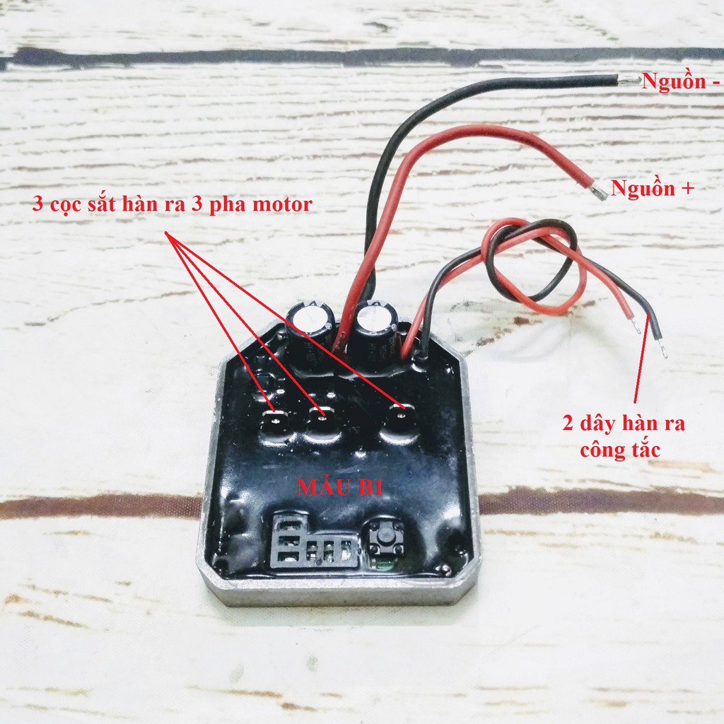 + Mẫu B: không có sẵn chân gài pin mà chỉ có dây nguồn B+ (màu đỏ) và B- (màu đen). Trên mạch có nút công tắc chỉnh 3 tốc độ động cơ, 3 vạch led hiển thị tình trạng pin, không có led chiếu sáng