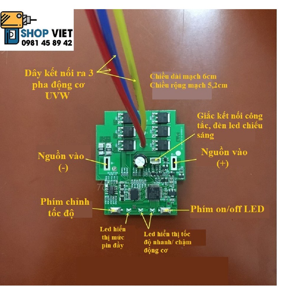 - Cách đấu nối: nguồn điện vào 18V-21V đấu đúng cực B- và B+, 3 dây lớn màu xanh đỏ vàng đấu ra 3 pha động cơ, 2 dây xanh nhỏ đấu ra công tắc, 2 dây đỏ đen nhỏ đấu ra bóng led chiếu sáng.