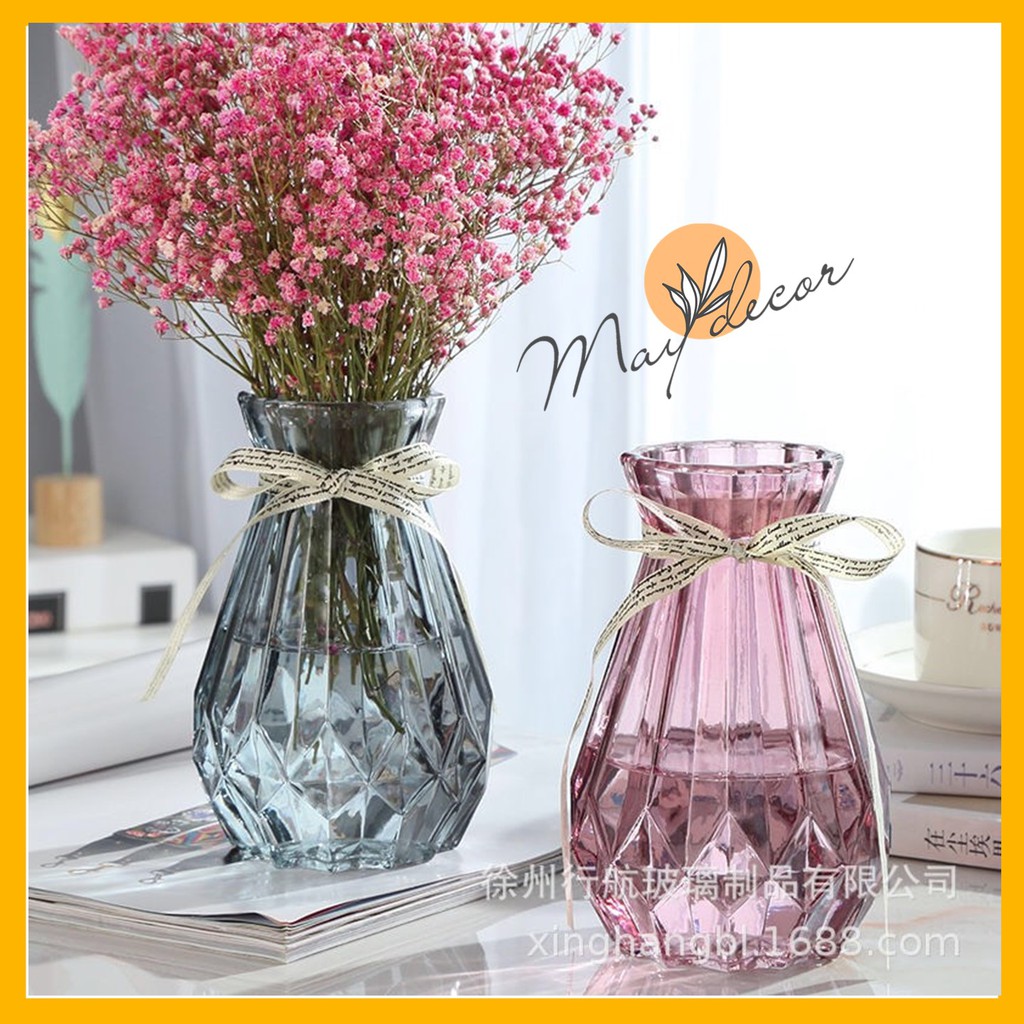 Nhà cửa & Đời sống > Trang trí nhà cửa > Bình trang trí || Lọ hoa thuỷ tinh đa giác tặng kèm nơ Maydecor bình hoa cao cấp cổ nhỏCòn hàng