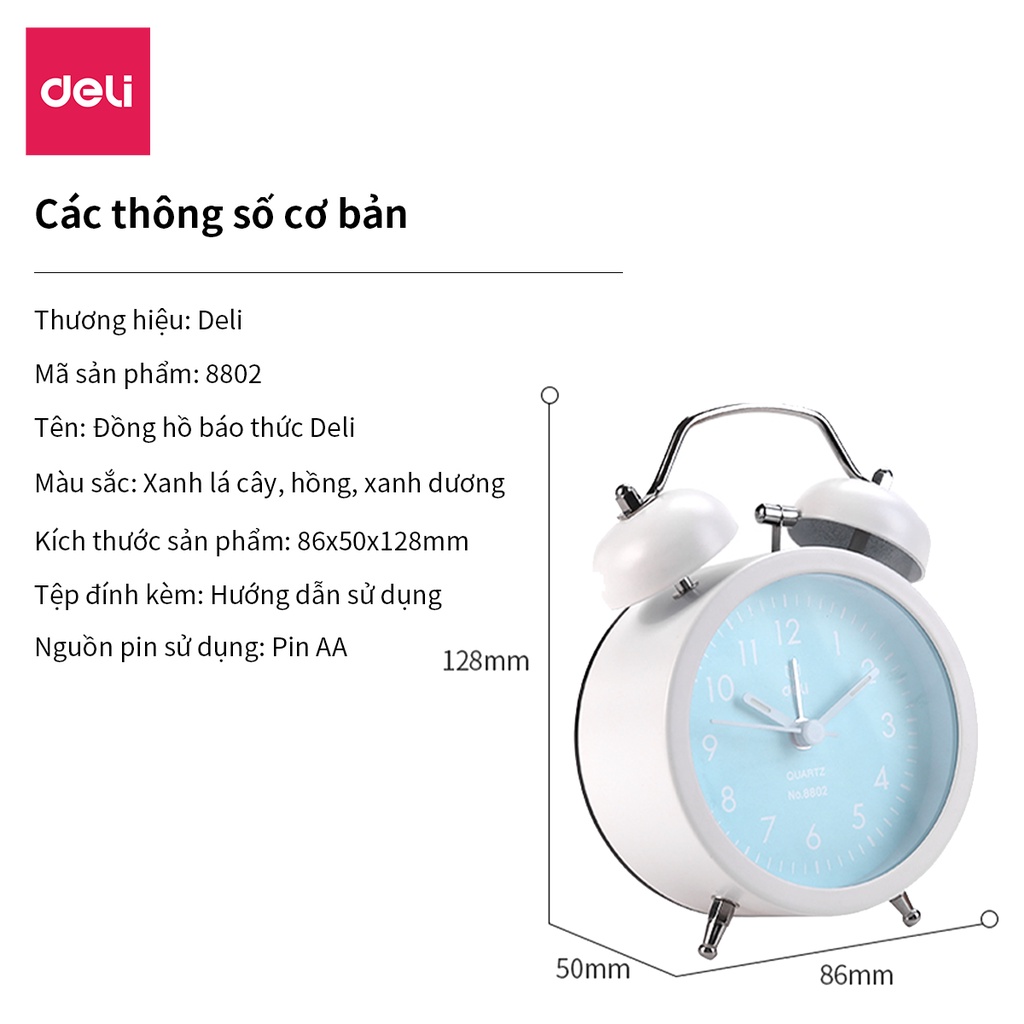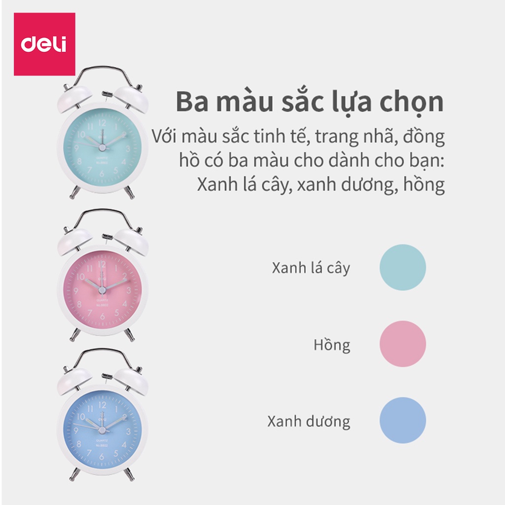 Giới thiệu [Mã LIFEDL44 giảm 50K đơn 99K] Đồng hồ báo thức Deli - Xanh dương/Xanh lá/ Hồng - 8802