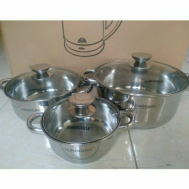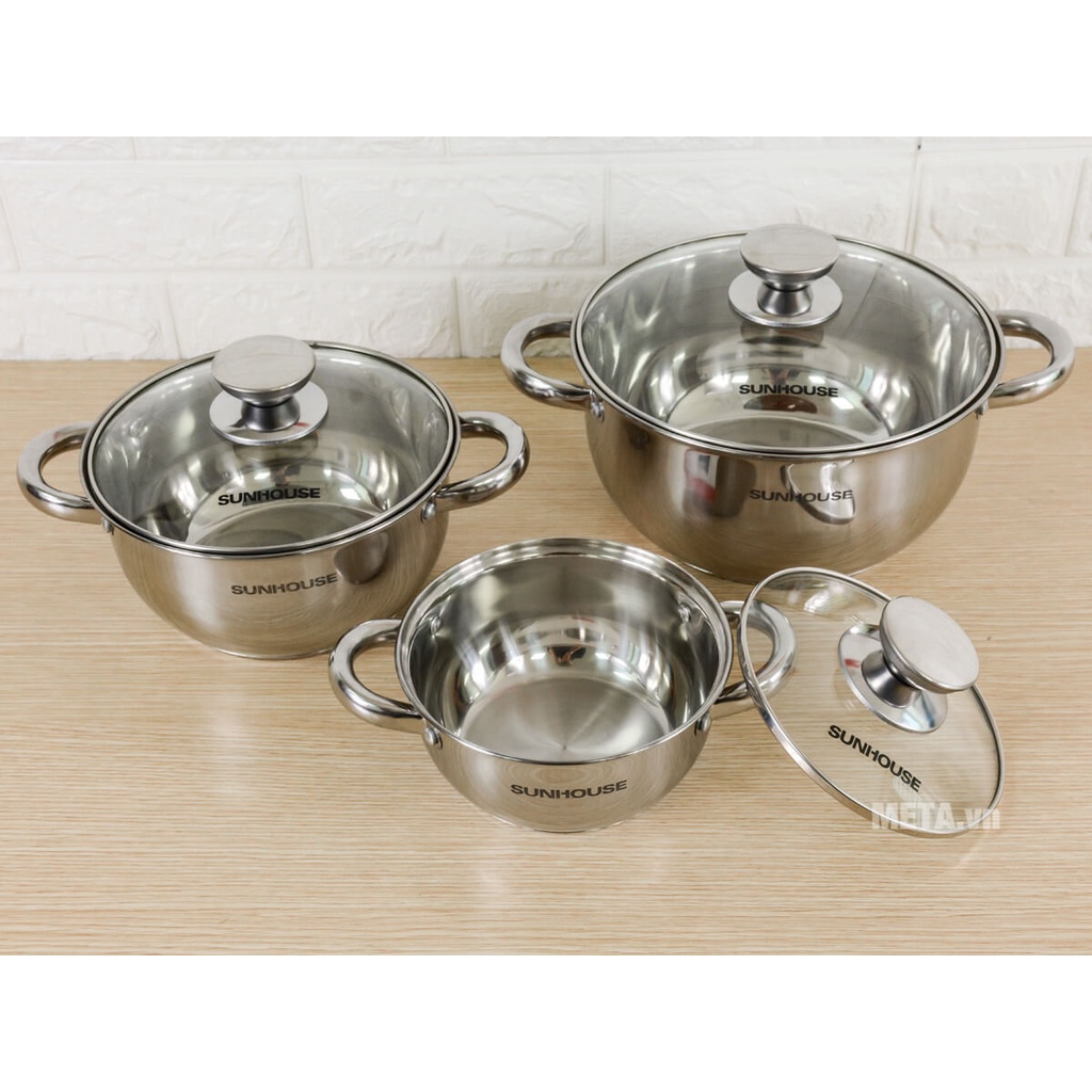 Bộ nồi inox 3 đáy sunhouse SH334(NẮP KIẾNG) HOẶC SH333 (NẮP INOX)